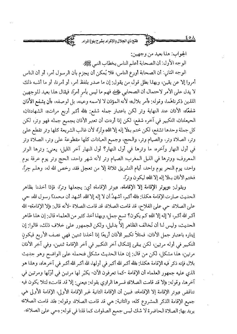 الوجه الثاني: أن الصحابة أورع الناس, فلا يمكن أن يجزم بأن الرسول أمر, أو أن الناس أمروا إلا عن يقين, وبهذا بطل قول من يقول: إن ما صدر بلفظ أمر, أو أمرنا, أو ما أشبه ذلك لا يدل على الأمر لاحتمال أن الصحابي رضي الله عنه فهم ما ليس بأمرٍ أمرًا, فيقال: هذا بعيد للوجهين اللذين ذكرناهما, وقوله: «أمر بلال»؛ لأنه المؤذن لا لاسمه وعينه, بل لوصفه, «أن يشفع الأذان شفعًا»؛ الأذان عند النهاية وتر لكن باعتبار جمله شفع: «الله أكبر أربع مرات» , الشهادتان, الحيعلتان, التكبير في آخر شفع, لكن إذا أردت أن تعتبر الأذان بجميع جمله فهو وتر, لكن كل جملة وحدها تشفع, لكن ختم بـ «لا إله إلا الله» وترًا؛ لأن غالب الشريعة كلها وتر تقطع على وتر, الصلاة وتر, والصيام وتر, والحج, وجميع العبادات كلها مقطوعة على وتر, الصلاة وتر في أول النهار وآخره, ما وترها في أول النهار؟ أول النهار آخر الليل؛ يعني: وترها الوتر المعروف, ووترها في الليل المغرب؛ الصيام وتر لأنه شهر واحد, الحج وتر يوم عرفة يوم واحد, يوم النحر يوم واحد, أيام التشريق ثلاثة إلا من تعجل فقد رخص الله له, وهلم جرا. فختم الأذان بـ «لا إله إلا الله» ليكون وترًا.