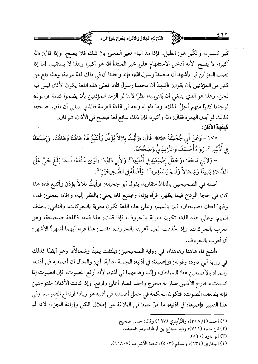 175 - وعن أبي جحيفة رضي الله عنه قال: «رأيت بلالًا يؤذن وأتتبع فاه هاهنا وهاهنا, وإصبعاه في أذنيه». رواه أحمد, والترمذي وصححه.