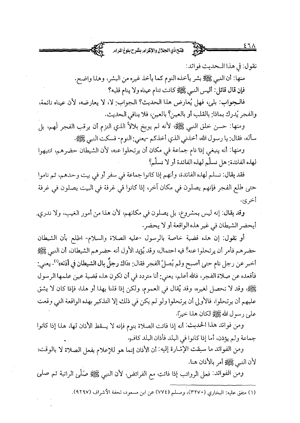 ومنها: أنه ينبغي إذا نام جماعة في مكان أن يرتحلوا عنه؛ لأن الشيطان حضرهم, انتبهوا لهذه الفائدة: هل نسلم لهذه الفائدة أو لا نسلم؟