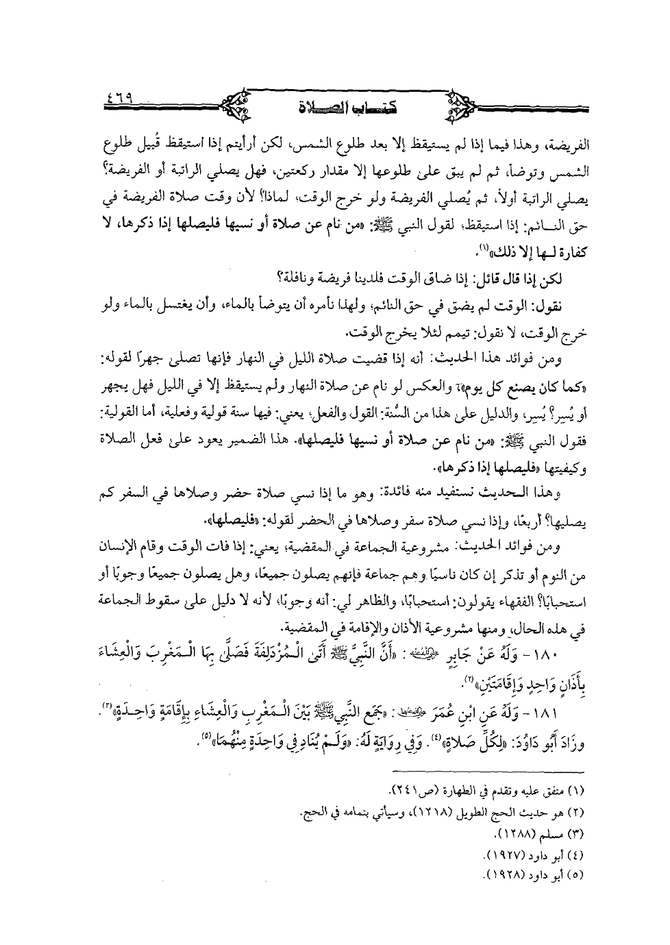الفريضة, وهذا فيما إذا لم يستيقظ إلا بعد طلوع الشمس, لكن أرأيتم إذا استيقظ قبيل طلوع الشمس وتوضأ, ثم لم يبق على طلوعها إلا مقدار ركعتين, فهل يصلي الراتبة أو الفريضة؟ يصلي الراتبة أولًا, ثم يصلي الفريضة ولو خرج الوقت, لماذا؟ لأن وقت صلاة الفريضة في حق النائم: إذا استيقظ؛ لقول النبي صلى الله عليه وسلم: «من نام عن صلاة أو نسيها فليصلها إذا ذكرها, لا كفارة لها إلا ذلك».