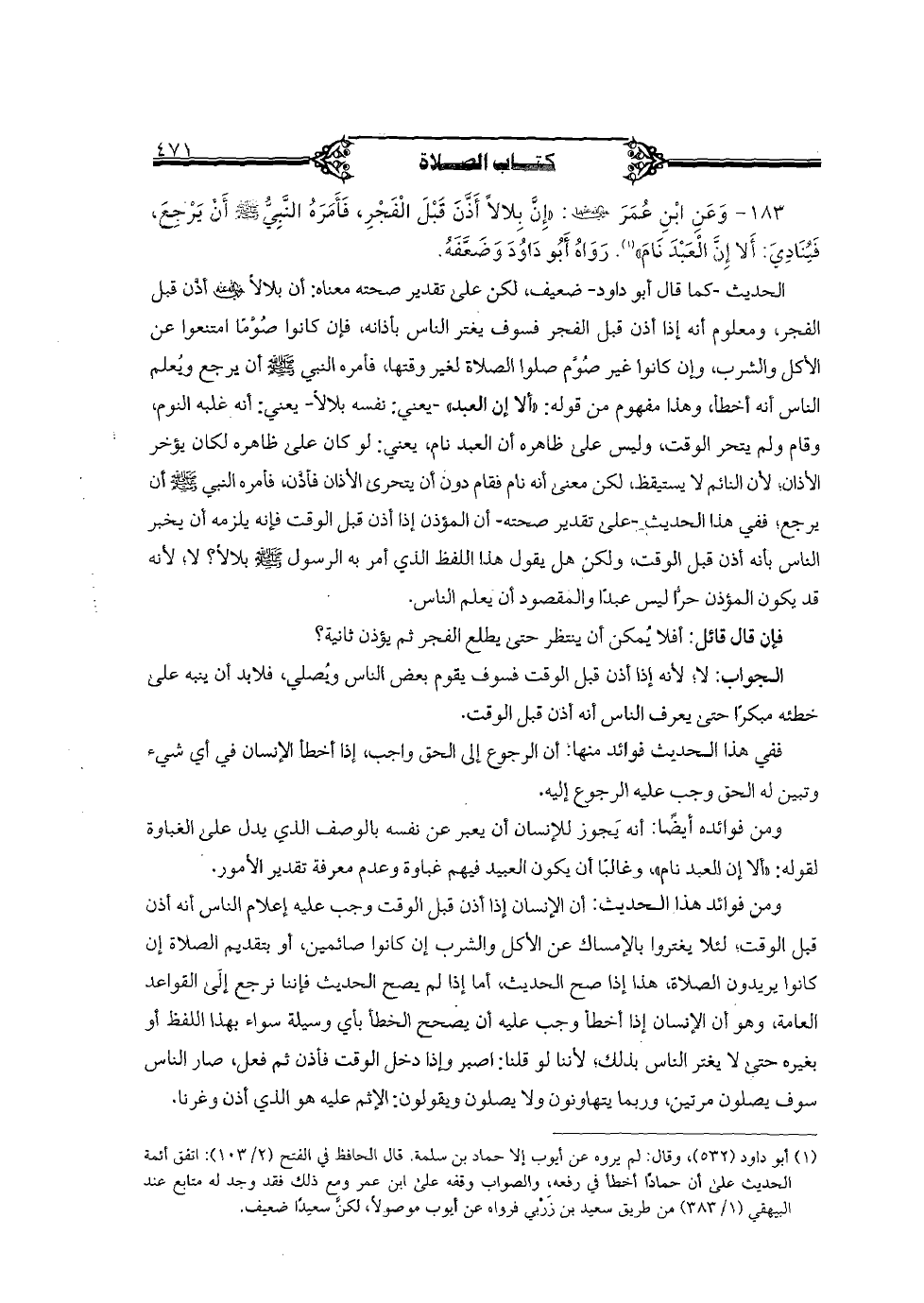 183 - وعن ابن عمر رضي الله عنهما: «إن بلالًا أذن قبل الفجر, فأمره النبي صلى الله عليه وسلم أن يرجع, فينادي: ألا إن العبد نام». رواه أبو داود وضعفه.