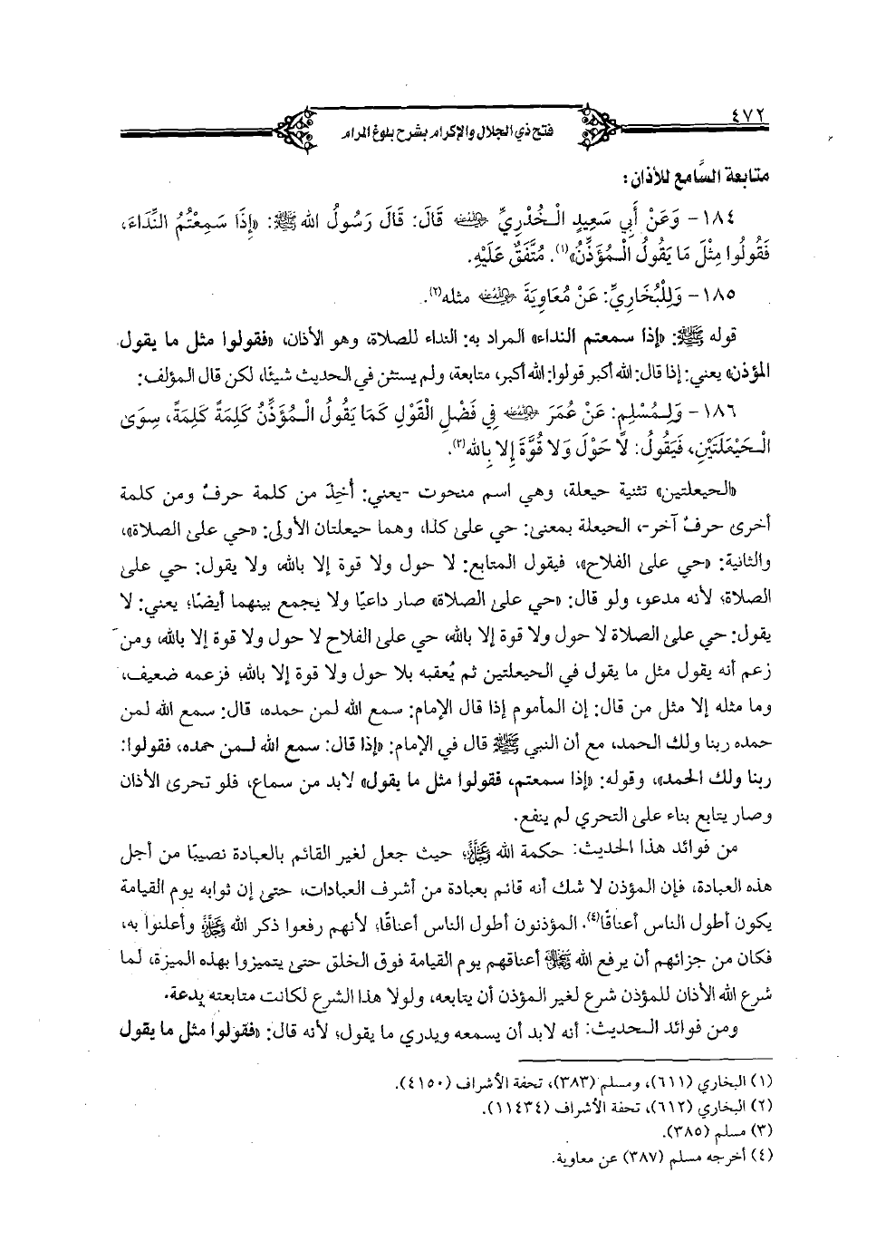 184 - وعن أبي سعيد الخدري رضي الله عنه قال: قال رسول الله صلى الله عليه وسلم: «إذا سمعتم النداء, فقولوا مثل ما يقول المؤذن». متفق عليه.