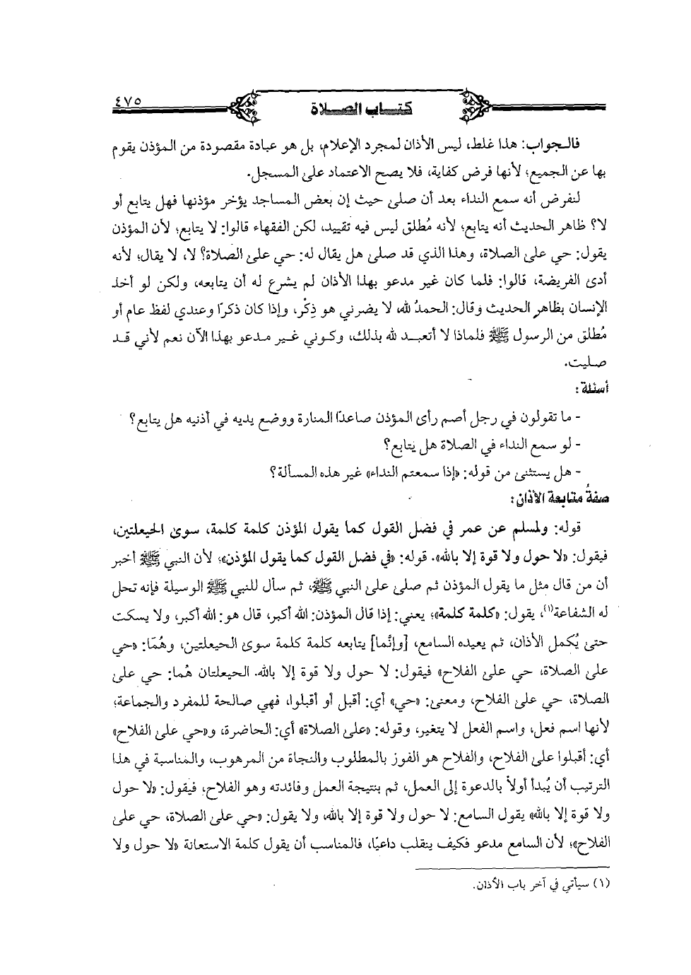 قوله: ولمسلم عن عمر في فضل القول كما يقول المؤذن كلمة كلمة, سوى الحيعلتين, فيقول: «لا حول ولا قوة إلا بالله». قوله: «في فضل القول كما يقول المؤذن»؛ لأن النبي صلى الله عليه وسلم أخبر أن من قال مثل ما يقول المؤذن ثم صلى على النبي صلى الله عليه وسلم, ثم سأل للنبي صلى الله عليه وسلم الوسيلة فإنه تحل له الشفاعة, يقول: «كلمة كلمة»؛ يعني: إذا قال المؤذن: الله أكبر, قال هو: الله أكبر, ولا يسكت حتى يكمل الأذان, ثم يعيده السامع, [وإنما] يتابعه كلمة كلمة سوى الحيعلتين, وهما: «حي على الصلاة, حي على الفلاح» فيقول: لا حول ولا قوة إلا بالله. الحيعلتين, وهما: «حي على الصلاة, حي على الفلاح» فيقول: لا حول ولا قوة إلا بالله. الحيعلتان هما: حي على الصلاة, حي على الفلاح, ومعنى: «حي» أي: أقبل أو أقبلوا, فهي صالحة للمفرد والجماعة؛ لأنها اسم فعل, واسم الفعل لا يتغير, وقوله: «على الصلاة» أي: الحاضرة, و «حي على الفلاح» أي: أقبلوا على الفلاح, والفلاح هو الفوز بالمطلوب والنجاة من المرهوب, والمناسبة في هذا الترتيب أن يبدأ أولًا بالدعوة إلى العمل, ثم بنتيجة العمل وفائدته وهو الفلاح, فيقول: «لا حول ولا قوة إلا بالله» يقول السامع: لا حول ولا قوة إلا بالله, ولا يقول: «حي على الصلاة, حي على الفلاح»؛ لأن السامع مدعو فكيف ينقلب داعيًا, فالمناسب أن يقول كلمة الاستعانة «لا حول ولا