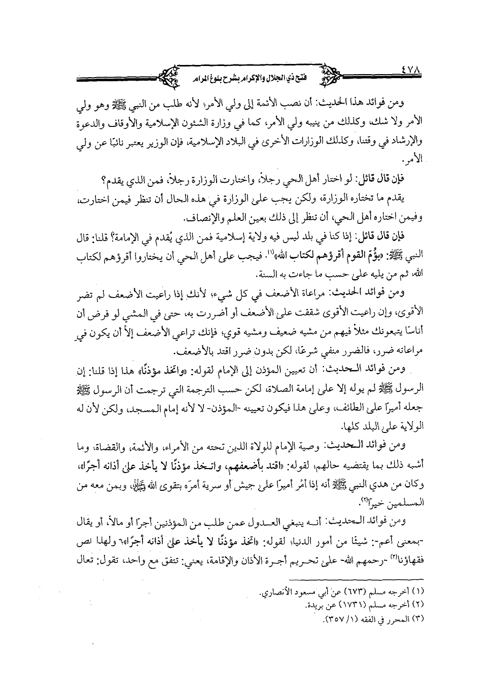 ومن فوائد الحديث: أن تعيين المؤذن إلى الإمام لقوله: «واتخذ مؤذنًا» هذا إذا قلنا: إن الرسول صلى الله عليه وسلم لم يوله إلا على إمامة الصلاة, لكن حسب الترجمة التي ترجمت أن الرسول صلى الله عليه وسلم جعله أميرًا على الطائف, وعلى هذا فيكون تعيينه - المؤذن - لا لأنه إمام المسجد, ولكن لأن له الولاية على البلد كلها.