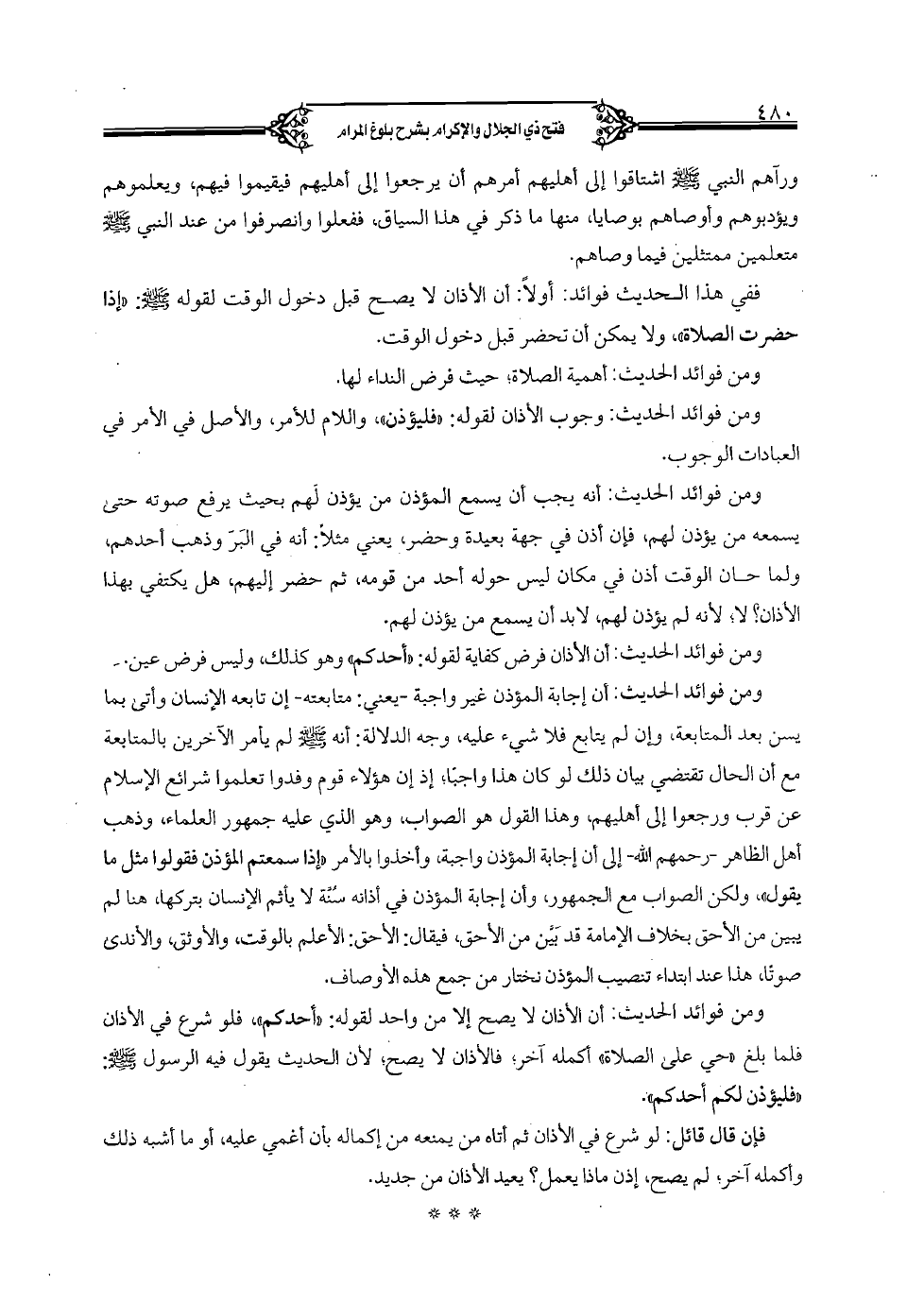 ومن فوائد الحديث: أن إجابة المؤذن غير واجبة - يعني: متابعته - إن تابعه الإنسان وأتى بما يسن بعد المتابعة, وإن لم يتابع فلا شيء عليه, وجه الدلالة: أنه صلى الله عليه وسلم لم يأمر الآخرين بالمتابعة مع أن الحال تقتضي بيان ذلك لو كان هذا واجبًا؛ إذ إن هؤلاء قوم وفدوا تعلموا شرائع الإسلام عن قرب ورجعوا إلى أهليهم, وهذا القول هو الصواب, وهو الذي عليه جمهور العلماء, وذهب أهل الظاهر - رحمهم الله - إلى أن إجابة المؤذن واجبة, وأخذوا بالأمر «إذا سمعتم المؤذن فقولوا مثل ما يقول» , ولكن الصواب مع الجمهور, وأن إجابة المؤذن في أذانه سنة لا يأثم الإنسان بتركها, هنا لم يبين من الأحق بخلاف الإمامة قد بين من الأحق, فيقال: الأحق: الأعلم بالوقت, والأوثق, والأندى صوتًا, هذا عند ابتداء تنصيب المؤذن نختار من جمع هذه الأوصاف.