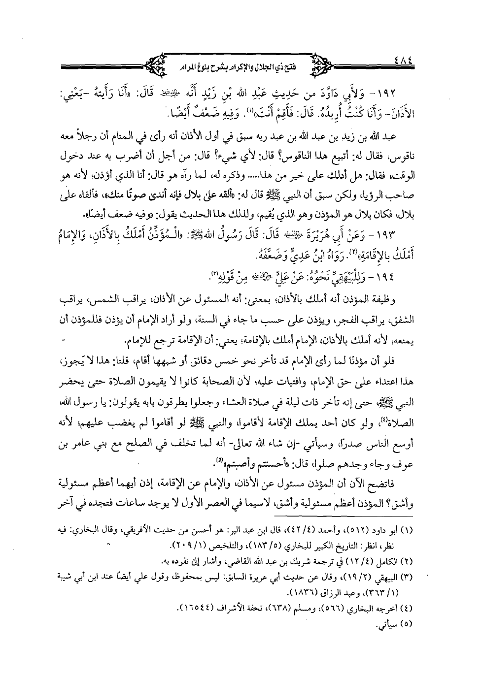 192 - ولأبي داود من حديث عبد الله بن زيدٍ أنه رضي الله عنهما قال: «أنا رأيته - يعني: الأذان - وأنا كنت أريده. قال: فأقم أنت». وفيه ضعف أيضًا.