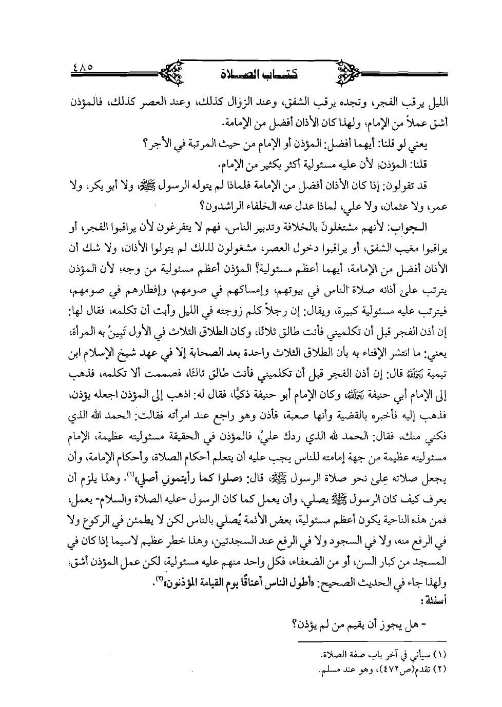 الجواب: لأنهم مشتغلون بالخلافة وتدبير الناس, فهم لا يتفرعون لأن يراقبوا الفجر, أو يراقبوا مغيب الشفق, أو يراقبوا دخول العصر, مشغولون لذلك لم يتولوا الأذان, ولا شك أن الأذان أفضل من الإمامة, أيهما أعظم مسئولية؟ المؤذن أعظم مسئولية من وجه؛ لأن المؤذن يترتب على أذانه صلاة الناس في بيوتهم, وإمساكهم في صومهم, وإفطارهم في صومهم, فيترتب عليه مسئولية كبيرة, ويقال: إن رجلًا كلم زوجته في الليل وأبت أن تكلمه, فقال لها: إن أذن الفجر قبل أن تكلميني فأنت طالق ثلاثا, وكان الطلاق الثلاث في الأول تبين به المرأة, يعني: ما انتشر الإفتاء به بأن الطلاق الثلاث واحدة بعد الصحابة إلا في عهد شيخ الإسلام ابن تيمية رحمه الله قال: إن أذن الفجر قبل أن تكلميني فأنت طالق ثالثًا, فصممت ألا تكلمه, فذهب إلى الإمام أبي حنيفة رحمه الله, وكان الإمام أبو حنيفة ذكيًا, فقال له: اذهب إلى المؤذن اجعله يؤذن, فذهب إليه فأخبره بالقضية وأنها صعبة, فأذن وهو راجع عند امرأته فقالت: الحمد الله الذي فكني منك, فقال: الحمد لله الذي ردك علي, فالمؤذن في الحقيقة مسئوليته عظيمة, الإمام مسئوليته عظيمة من جهة إمامته للناس يجب عليه أن يتعلم أحكام الصلاة, وأحكام الإمامة, وأن يجعل صلاته على نحو صلاة الرسول صلى الله عليه وسلم, قال: «صلوا كما رأيتموني أصلي». وهذا يلزم أن يعرف كيف كان الرسول صلى الله عليه وسلم يصلي, وأن يعمل كما كان الرسول - عليه الصلاة والسلام - يعمل, فمن هذه الناحية يكون أعظم مسئولية, بعض الأئمة يصلي بالناس لكن لا يطمئن في الركوع ولا في الرفع منه, ولا في السجود ولا في الرفع عند السجدتين, وهذا خطر عظيم لاسيما إذا كان في المسجد من كبار السن, أو من الضعفاء, فكل واحد منهم عليه مسئولية, لكن عمل المؤذن أشق؛ ولهذا جاء في الحديث الصحيح: «أطول الناس أعناقًا يوم القيامة المؤذنون».