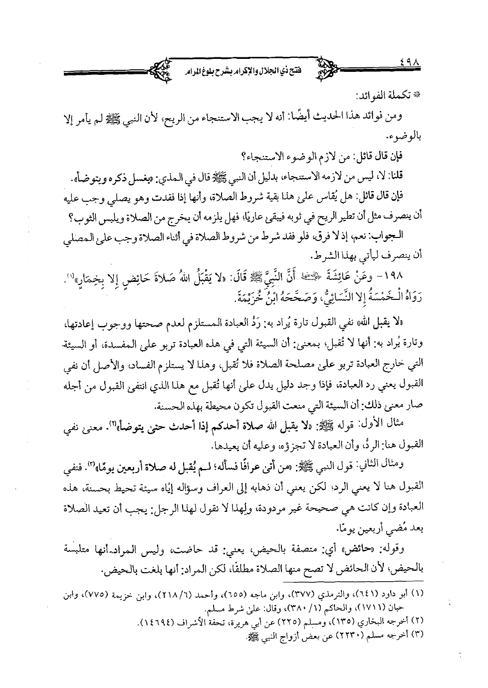 198 - وعن عائشة رضي الله عنها أن النبي صلى الله عليه وسلم قال: «لا يقبل الله صلاة حائض إلا بخمار». رواه الخمسة إلا النسائي, وصححه ابن خزيمة.