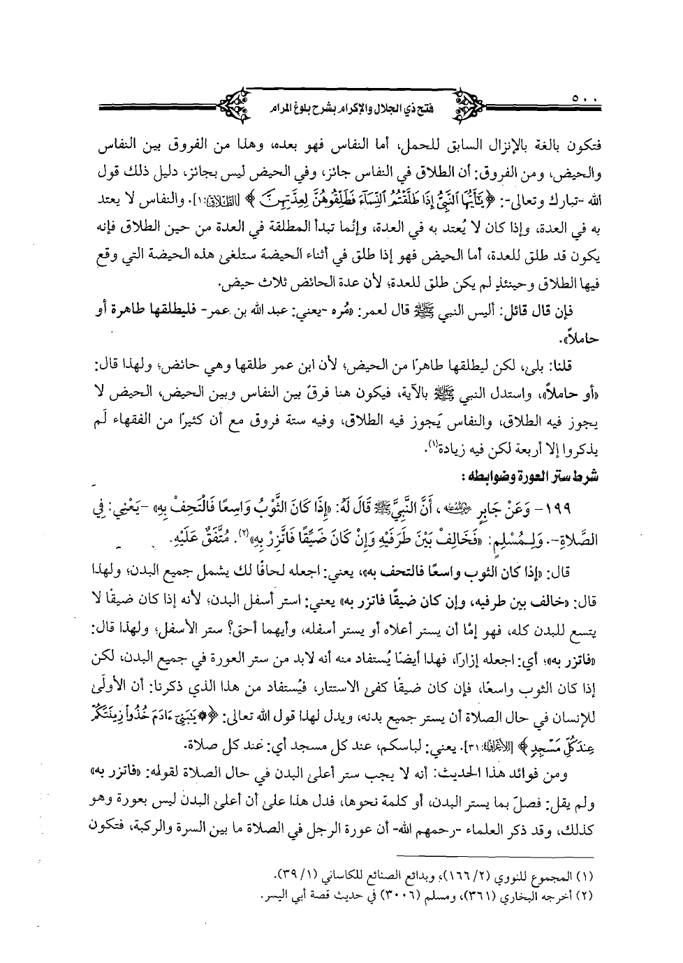 199 - وعن جابر رضي الله عنه, أن النبي صلى الله عليه وسلم قال له: «إذا كان الثوب واسعًا فالتحق به» - يعني: في الصلاة -. ولمسلم: «فخالف بين طرفيه وإن كان ضيقًا فاتزر به». متفق عليه.