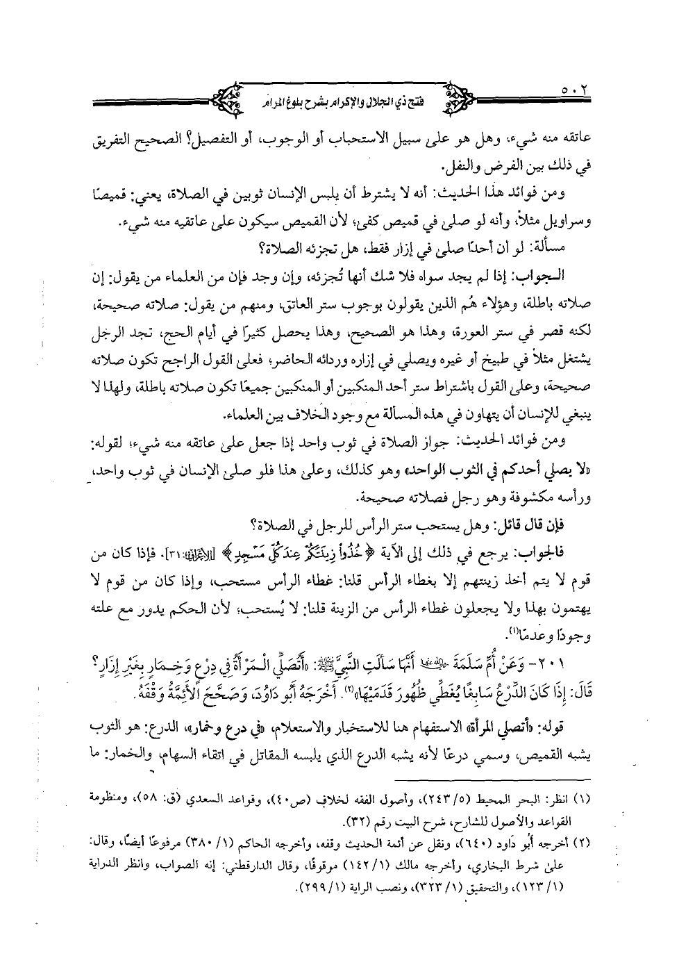ومن فوائد هذا الحديث: جواز الصلاة في ثوب واحد إذا جعل على عاتقه منه شيء؛ لقوله: «لا يصلي أحدكم في الثوب الواحد» وهو كذلك, وعلى هذا فلو صلى الإنسان في ثوب واحد, ورأسه مكشوفة وهو رجل فصلاته صحيحة.