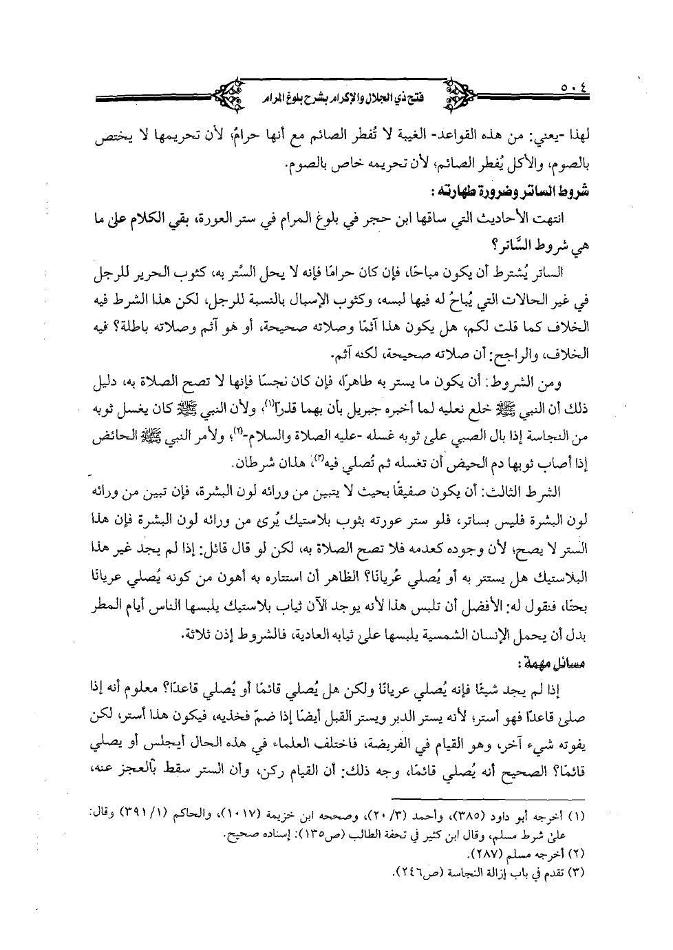 انتهت الأحاديث التي ساقها ابن حجر في بلوغ المرام في ستر العورة, بقي الكلام على ما هي شروط الساتر؟