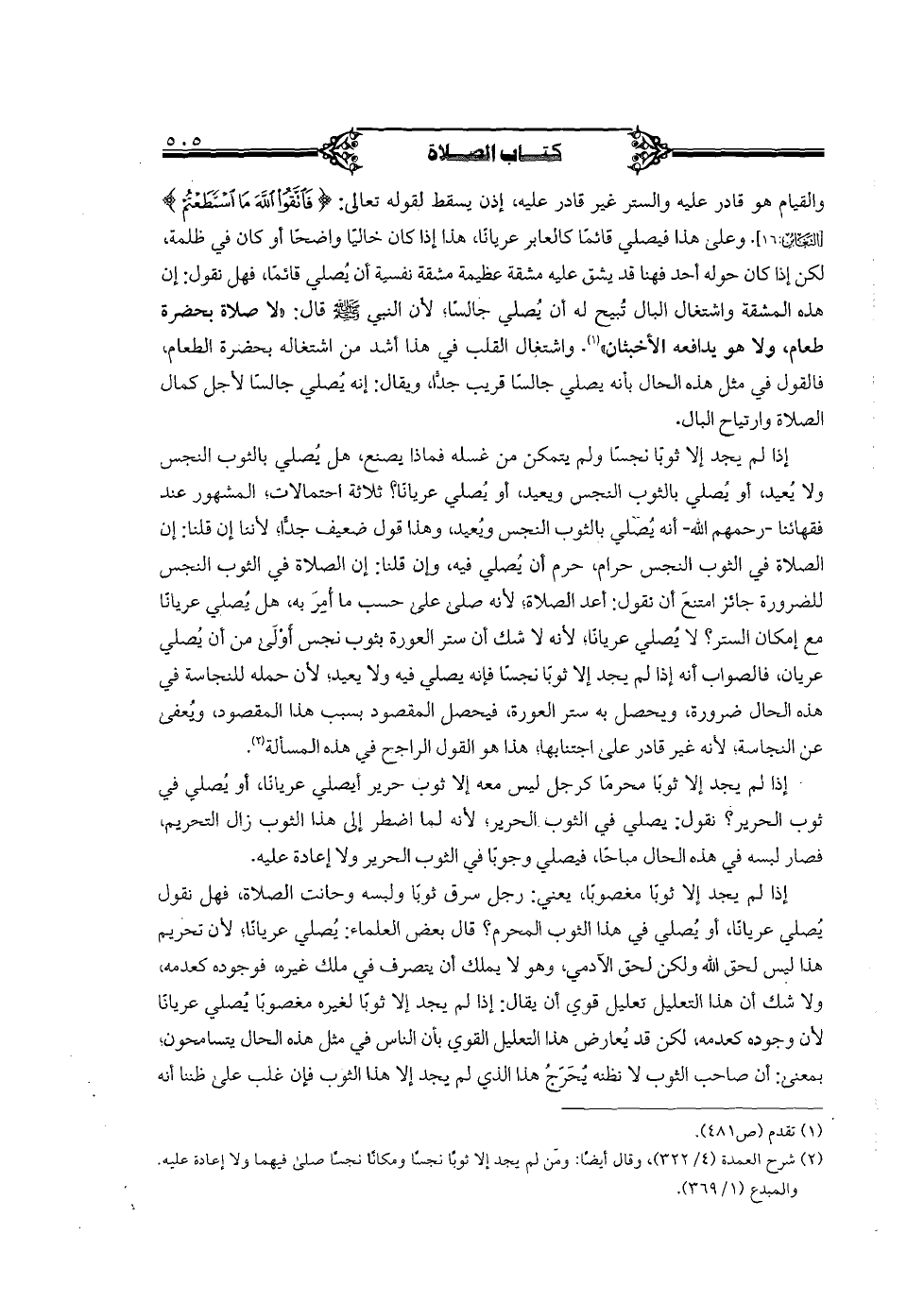 والقيام هو قادر عليه والستر غير قادر عليه, إذن يسقط لقوله تعالى: {فاتقوا الله ما استطعتم} [التغابن: 16]. وعلى هذا فيصلي قائمًا كالعابر عريانًا, هذا إذا كان خاليًا واضحًا أو كان في ظلمة, لكن إذا كان حوله أحد فهنا قد يشق عليه مشقة عظيمة مشقة نفسية أن يصلي قائمًا, فهل نقول: إن هذه المشقة واشتغال البال تبيح له أن يصلي جالسًا؛ لأن النبي صلى الله عليه وسلم قال: «لا صلاة بحضرة طعام, ولا هو يدافعه الأخبثان». واشتغال القلب في هذا أشد من اشتغاله بحضرة الطعام, فالقول في مثل هذه الحال بأنه يصلي جالسًا قريب جدًا, ويقال: إنه يصلي جالسًا لأجل كمال الصلاة وارتياح البال.