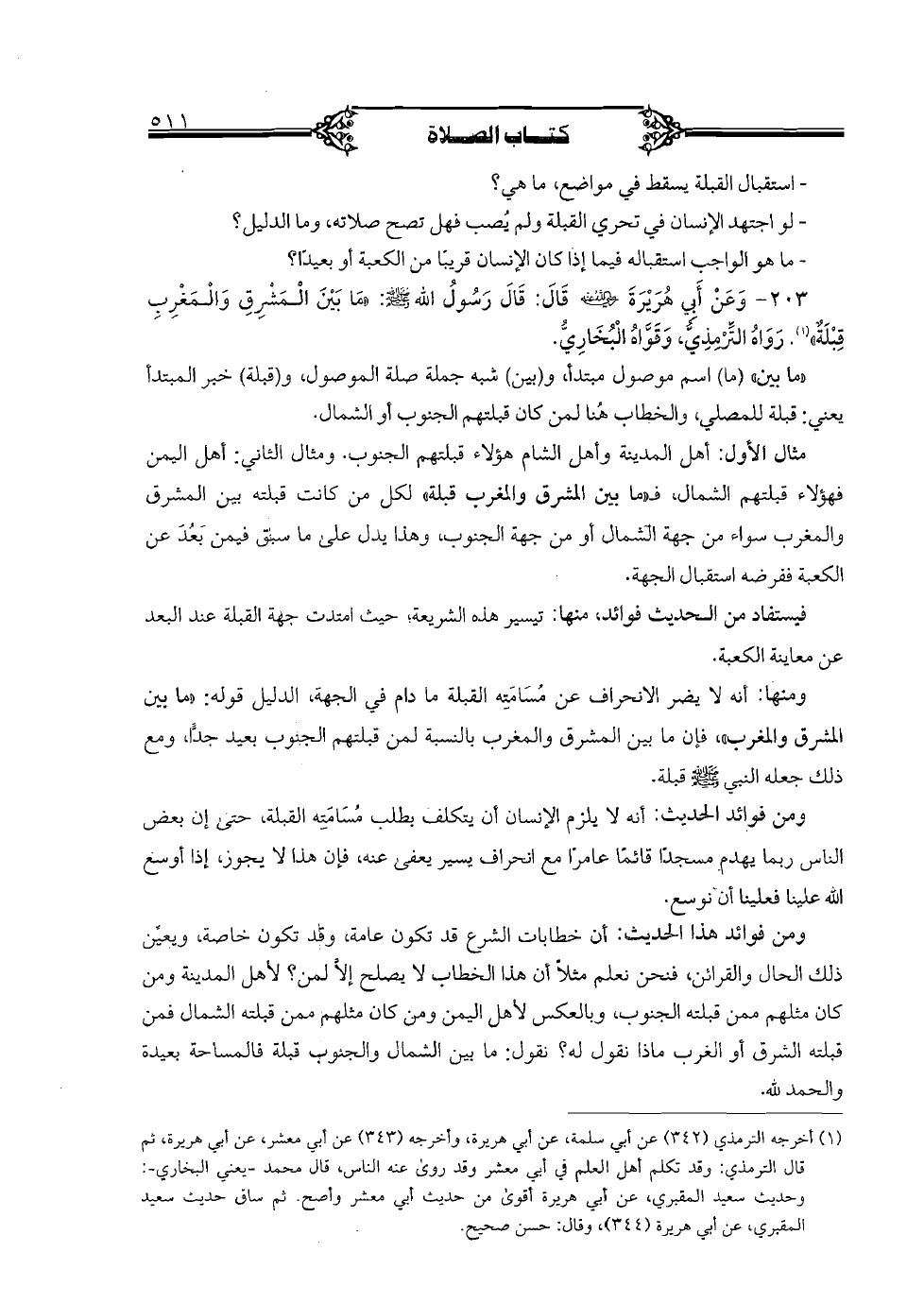 203 - وعن أبي هريرة رضي الله عنه قال: قال رسول الله صلى الله عليه وسلم: «ما بين المشرق والمغرب قبلة». رواه الترمذي, وقواه البخاري.