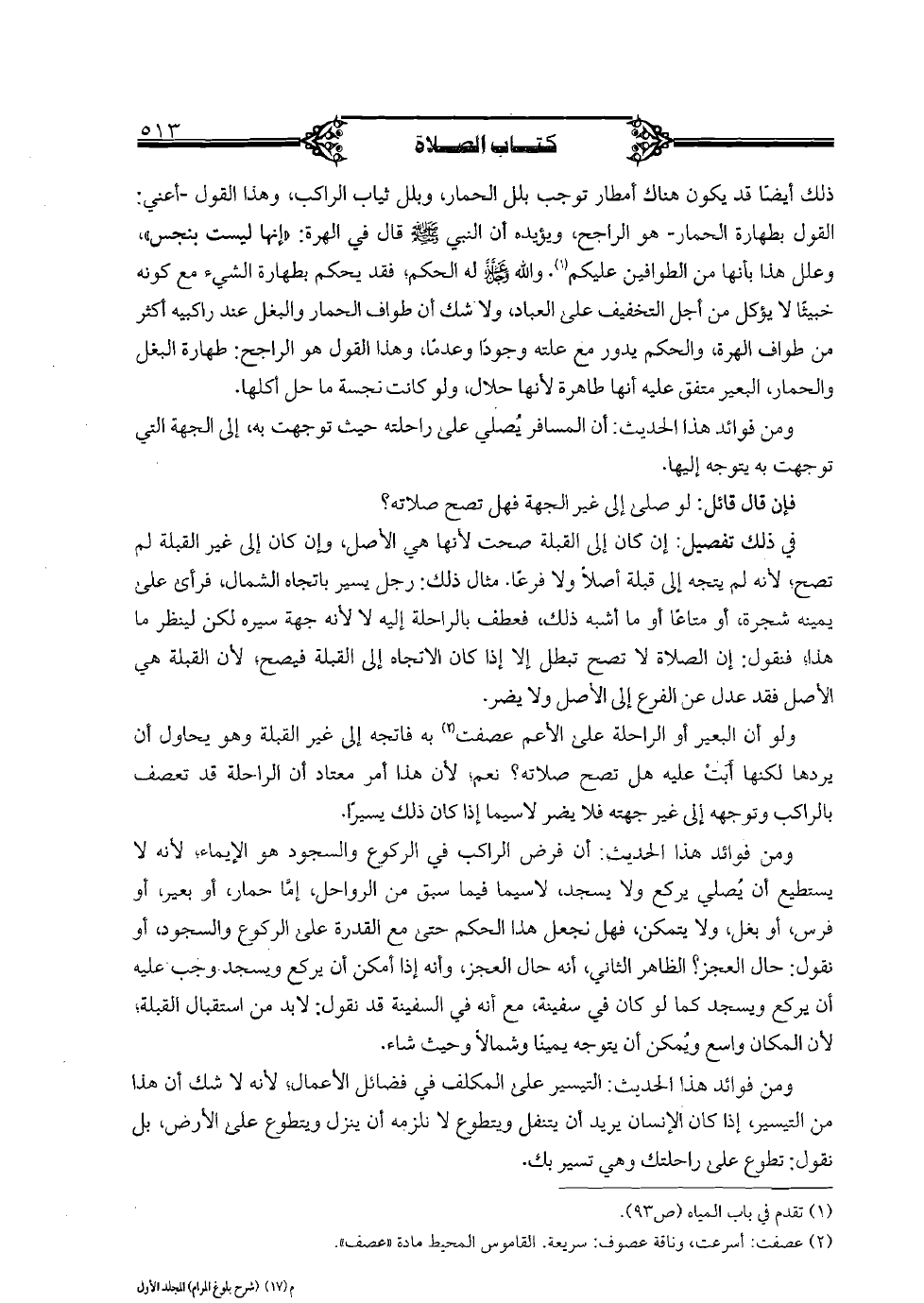 ولو أن البعير أو الراحلة على الأعم عصفت به فاتجه إلى غير القبلة وهو يحاول أن يردها لكنها أبت عليه هل تصح صلاته؟ نعم؛ لأن هذا أمر معتاد أن الراحلة قد تعصف بالراكب وتوجهه إلى غير جهته فلا يضر لاسيما إذا كان ذلك يسيرًا.