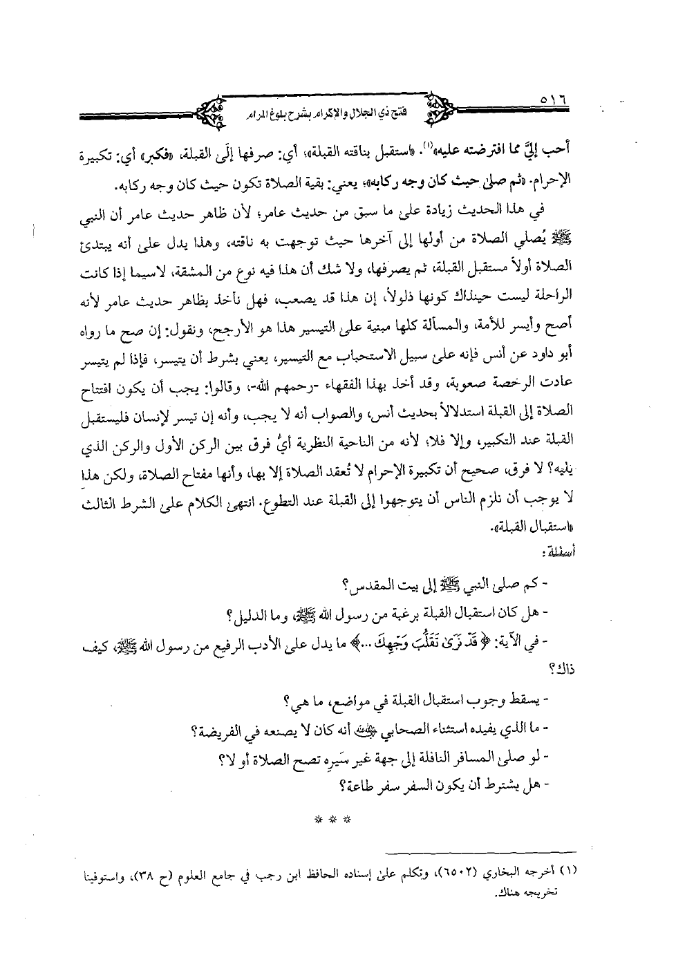 في هذا الحديث زيادة على ما سبق من حديث عامر؛ لأن ظاهر حديث عامر أن النبي صلى الله عليه وسلم يصلي الصلاة من أولها إلى آخرها حيث توجهت به ناقته, وهذا يدل على أنه يبتدئ الصلاة أولًا مستقبل القبلة, ثم يصرفها, ولا شك أن هذا فيه نوع من المشقة, لاسيما إذا كانت الراحلة ليست حينذاك كونها ذلولًا, إن هذا قد يصعب, فهل نأخذ بظاهر حديث عامر لأنه أصح وأيسر للأمة, والمسألة كلها مبنية على التيسير هذا هو الأرجح, ونقول: إن صح ما رواه أبو داود عن أنس فإنه على سبيل الاستحباب مع التيسير, يعني بشرط أن يتيسر, فإذا لم يتيسر عادت الرخصة صعوبة, وقد أخذ بهذا الفقهاء - رحمهم الله -, وقالوا: يجب أن يكون افتتاح الصلاة إلى القبلة استدلالًا بحديث أنس, والصواب أنه لا يجب, وأنه إن تيسر لإنسان فليستقبل القبلة عند التكبير, وإلا فلا؛ لأنه من الناحية النظرية أي فرق بين الركن الأول والركن الذي يليه؟ لا فرق, صحيح أن تكبيرة الإحرام لا تعقد الصلاة إلا بها, وأنها مفتاح الصلاة, ولكن هذا لا يوجب أن نلزم الناس أن يتوجهوا إلى القبلة عند التطوع. انتهى الكلام على الشرط الثالث «استقبال القبلة».