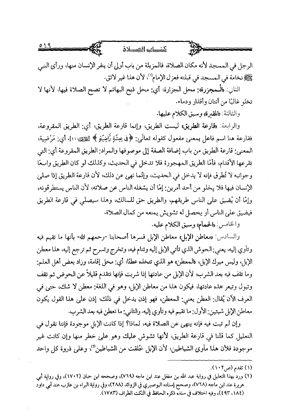 وإن لم تبت فيه فإنه ينهى عن الصلاة فيه, لماذا؟ إذا كانت الإبل موجودة فإننا نقول في التعليل كما قلنا في قارعة الطريق؛ لأنها تشوش عليك وهو على خطر منها وإن كانت غير موجودة فلأن هذا مأوى الشياطين؛ لأن الإبل خلقت من الشياطين, وعلى ذروة كل واحد