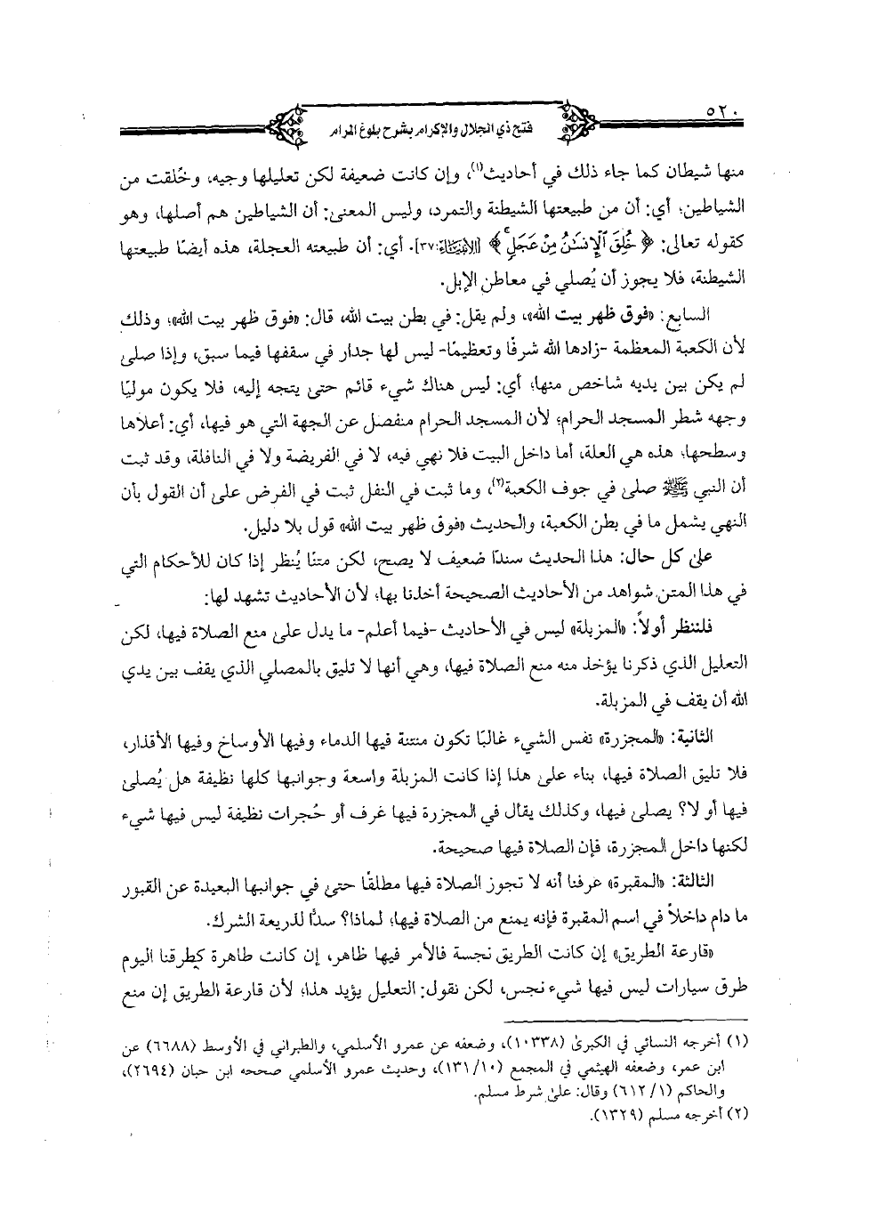 السابع: «فوق ظهر بيت الله» , ولم يقل: في بطن بيت الله, قال: «فوق ظهر بيت الله»؛ وذلك لأن الكعبة المعظمة - زادها الله شرفًا وتعظيمًا - ليس لها جدار في سقفها فيما سبق, وإذا صلى لم يكن بين يديه شاخص منها؛ أي: ليس هناك شيء قائم حتى يتجه إليه, فلا يكون موليًا وجهه شطر المسجد الحرام؛ لأن المسجد الحرام منفصل عن الجهة التي هو فيها, أي: أعلاها وسطحها؛ هذه هي العلة, أما داخل البيت فلا نهي فيه, لا في الفريضة ولا في النافلة, وقد ثبت أن النبي صلى الله عليه وسلم صلى في جوف الكعبة, وما ثبت في النفل ثبت في الفرض على أن القول بأن النهي يشمل ما في بطن الكعبة, والحديث «فوق ظهر بيت الله» قول بلا دليل.