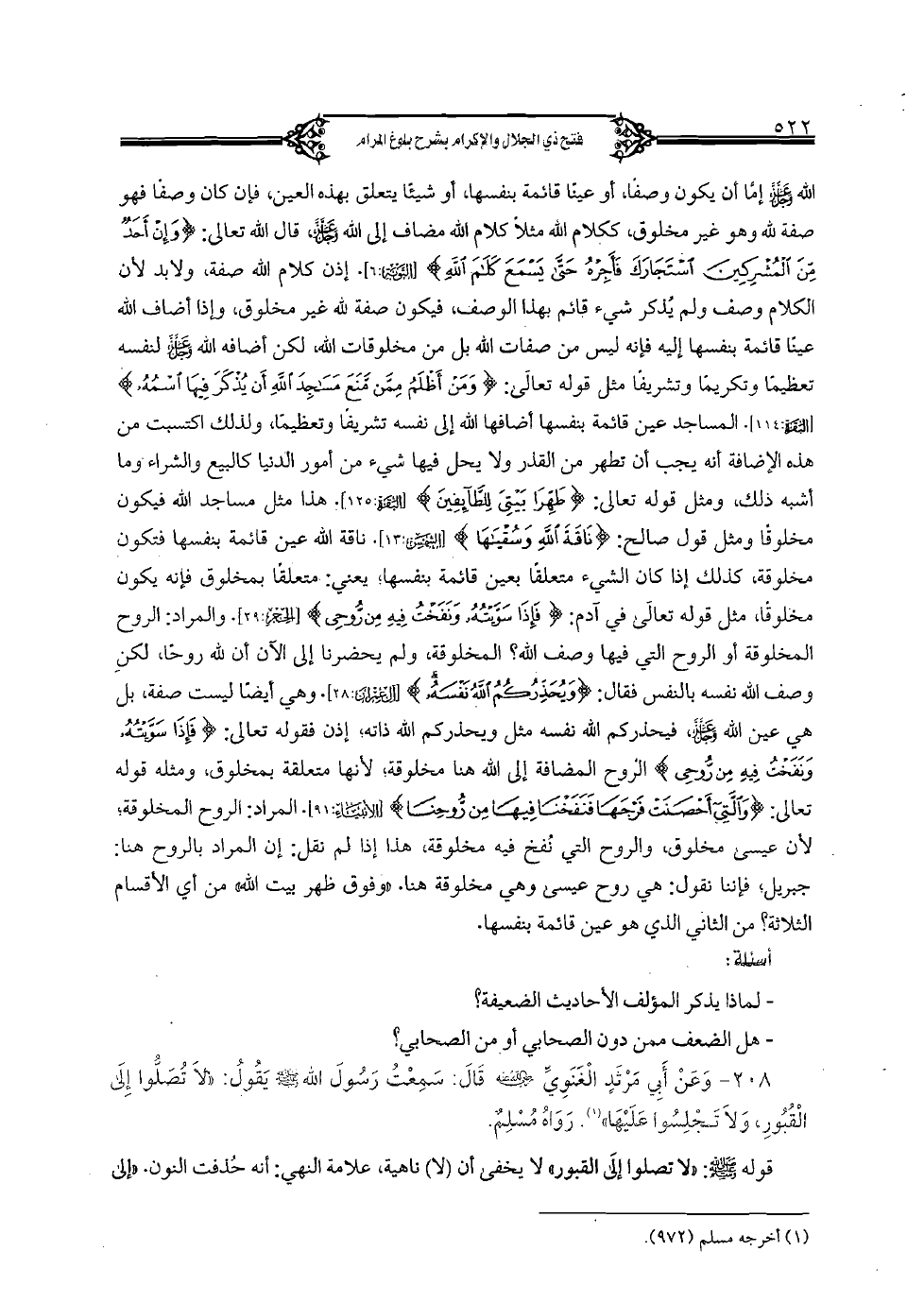 الله عز وجل إما أن يكون وصفًا, أو عينًا قائمة بنفسها, أو شيئًا يتعلق بهذه العين, فإن كان وصفًا فهو صفة لله وهو غير مخلوق, ككلام الله مثلًا كلام الله مضاف إلى الله عز وجل, قال الله تعالى: {وإن أحد من المشركين استجارك فأجره حتى يسمع كلام الله} [التوبة: 6]. إذن كلام الله صفة, ولابد لأن الكلام وصف ولم يذكر شيء قائم بهذا الوصف, فيكون صفة لله غير مخلوق, وإذا أضاف الله عينًا قائمة بنفسها إليه فإنه ليس من صفات الله بل من مخلوقات الله, لكن أضافه الله عز وجل لنفسه تعظيمًا وتكريمًا وتشريفًا مثل قوله تعالى: {ومن أظلم ممن منع مساجد الله أن يذكر فيها اسمه} [البقرة: 114]. المساجد عين قائمة بنفسها أضافها الله إلى نفسه تشريفًا وتعظيمًا, ولذلك اكتسبت من هذه الإضافة أنه يجب أن تطهر من القذر ولا يحل فيها شيء من أمور الدنيا كالبيع والشراء وما أشبه ذلك, ومثل قوله تعالى: {طهرًا بيتي للطائفين} [البقرة: 125]. هذا مثل مساجد الله فيكون مخلوقًا ومثل قول صالح: {ناقة الله وسقياها} [الشمس: 13]. ناقة الله عين قائمة بنفسها فتكون مخلوقة, كذلك إذا كان الشيء متعلقًا بعين قائمة بنفسها؛ يعني متعلقًا بمخلوق فإنه يكون مخلوقًا مثل قوله تعالى في آدم: {فإذا سويته ونفخت فيه من روحي} [الحجر: 29]. والمراد: الروح المخلوقة أو الروح التي فيها وصف الله؟ المخلوقة, ولم يحضرنا إلى الآن أن لله روحًا, لكن وصف الله نفسه بالنفس فقال: {ويحذركم الله نفسه} [آل عمران: 28]. وهي أيضًا ليست صفة, بل هي عين الله عز وجل, فيحذركم الله نفسه مثل ويحذركم الله ذاته؛ إذن فقوله تعالى: {فإذا سويته ونفخت فيه من روحي} الروح المضافة إلى الله هنا مخلوقة؛ لأنها متعلقة بمخلوق, ومثله قوله تعالى: {والتي أحصنت فرجها فنفخنا فيها من روحنا} [الأنبياء: 91]. المراد: الروح المخلوقة؛ لأن عيسى مخلوق, والروح التي نفخ فيه مخلوقة, هذا إذا لم نقل: إن المراد بالروح هنا: جبريل؛ فإننا نقول: هي روح عيسى وهي مخلوقة هنا. «وفوق ظهر بيت الله» من أي الأقسام الثلاثة؟ من الثاني الذي هو عين قائمة بنفسها.