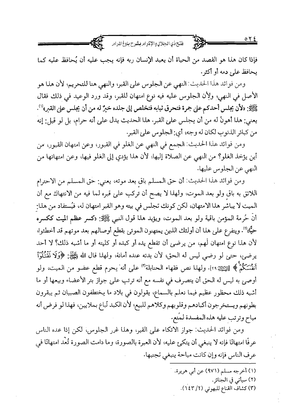 ومن فوائد هذا الحديث: أن حق المسلم باقٍ بعد موته, يعني: حق المسلم من الاحترام اللائق به باقٍ ولو بعد الموت؛ ولهذا لا يصح أن تركب على قبره لما فيه من الانتهاك مع أن الميت لا يباشر هذا الامتهان, لكن كونك تجلس في بيته وهو القبر امتهان له, فيستفاد من هذا: أن حرمة المؤمن باقية ولو بعد الموت ويؤيد هذا قول النبي صلى الله عليه وسلم: «كسر عظم الميت ككسره حيا». ويتفرع على هذا أن أولئك الذين يمتهنون الموتى بقطع أوصالهم بعد موتاهم قد أخطئوا؛ لأن هذا نوع امتهان لهم, من يرضى أن تقطع يده أو كبده أو كليته أو ما أشبه ذلك؟ لا أحد يرضى, حتى لو رضي ليس له الحق؛ لأن بدنه عنده أمانة؛ ولهذا قال الله عز وجل: {ولا تقتلوا أنفسكم} [النساء: 29]. ولهذا نص فقهاء الحنابلة على أنه يحرم قطع عضو من الميت, ولو أوصى به ليس له الحق أن يتصرف في نفسه مع أنه ترتب على جواز بتر الأعضاء وبيعها أو ما أشبه ذلك محظور عظيم فيما نعلم بالسماع, يقولون: في بلاد ما يختطفون الصبيان ثم يبقرون بطونهم ويستخرجون أكبادهم وقلوبهم وكلاهم للبيع؛ لأن الكبد تباع بملايين, فهذا لو فرض أنه مباح وترتب عليه هذه المفسدة لمنع.