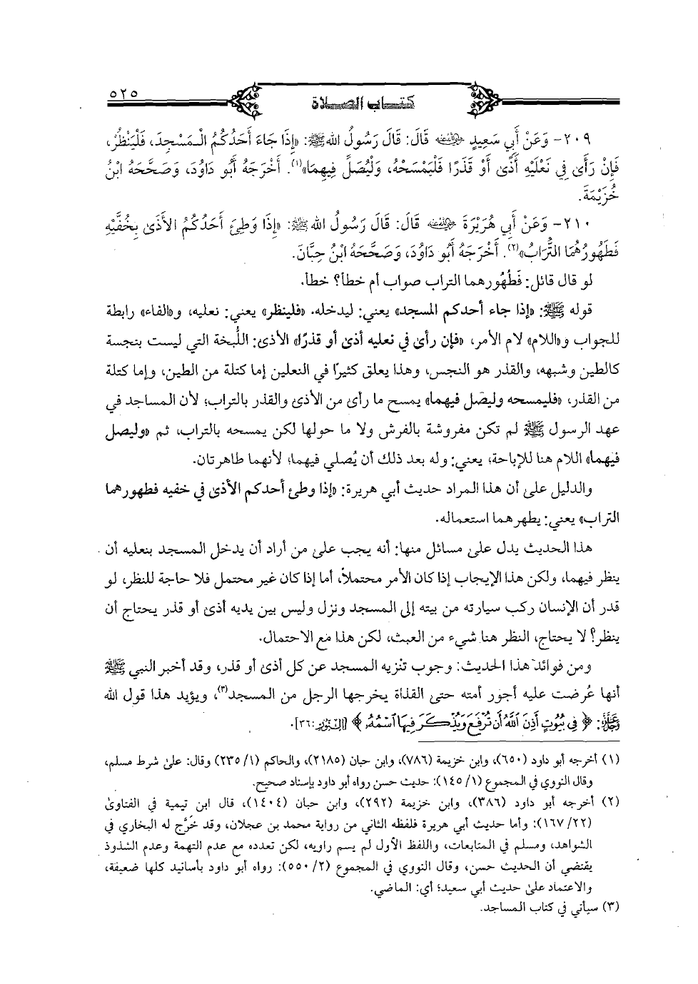 209 - وعن أبي سعيد رضي الله عنه قال: قال رسول الله صلى الله عليه وسلم: «إذا جاء أحدكم المسجد, فلينظر, فإن رأى في نعليه أذى أو قذرًا فليمسحه, وليصل فيهما». أخرجه أبو داود, وصححه ابن خزيمة.