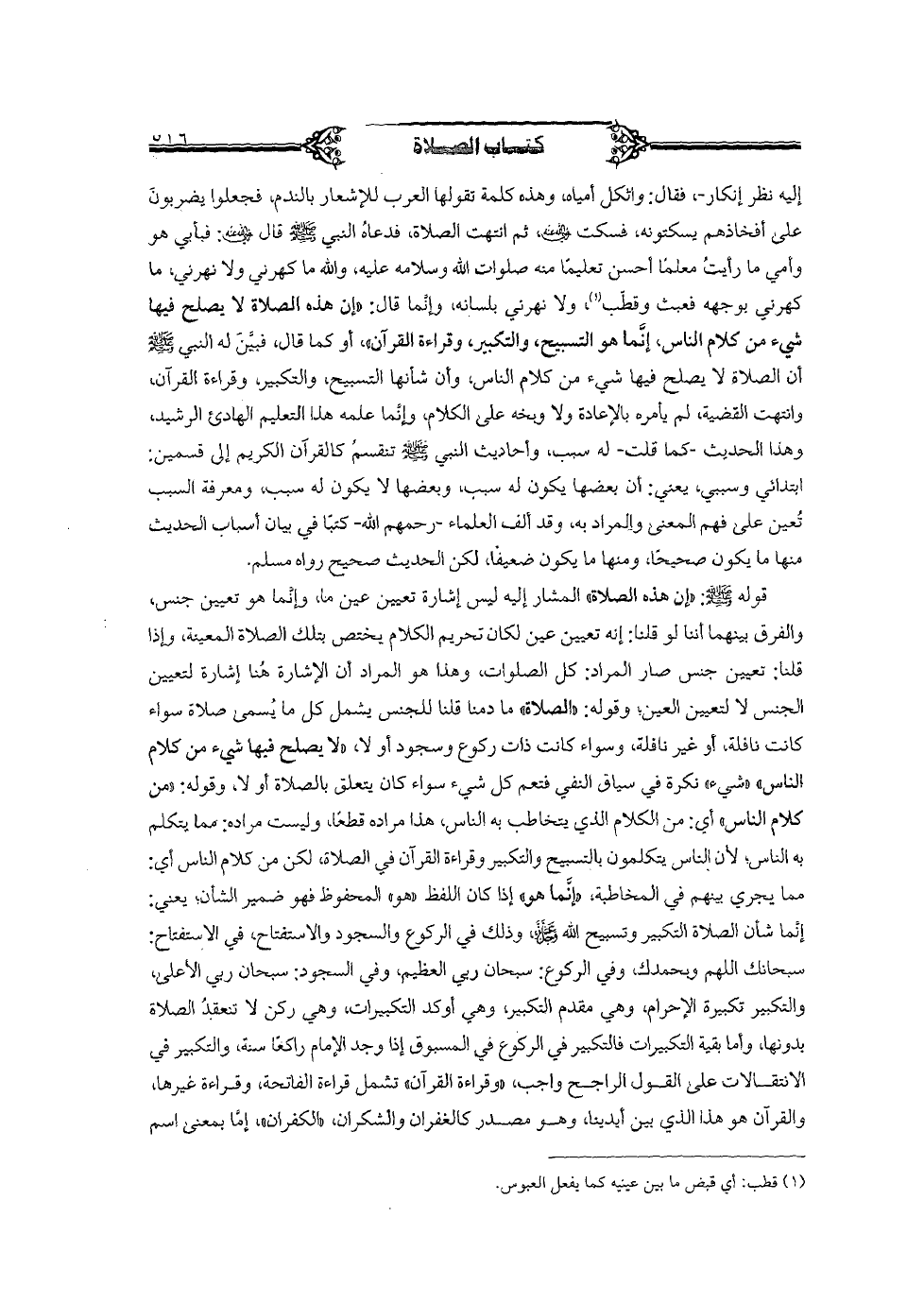 إليه نظر إنكار-، فقال: واثكل أمياه، وهذه كلمة تقولها العرب للإشعار بالندم، فجعلوا يضربون على أفخاذهم يسكتونه، فسكت رضي الله عنه، ثم انتهت الصلاة، فدعاه النبي صلى الله عليه وسلم قال رضي الله عنه: فبأبي هو وأمي ما رأيت معلما أحسن تعليما منه صلوات الله وسلامه عليه، والله ما كهرني ولا نهرني، ما كهرني بوجهه فبعث وقطب، ولا نهرني بلسانه، وإنما قال: "إن هذه الصلاة لا يصلح فيها شيء من كلام الناس، إنما هو التسبيح، والتكبير، وقراءة القرآن، أو كما قال، فبين له النبي صلى الله عليه وسلم أن الصلاة لا يصلح فيها شيء من كلام الناس، وأن شأنها التسبيح، والتكبير، وقراءة القرآن، وانتهت القضية، لم يأمره بالإعادة ولا وبخه على الكلام، وإنما علمه هذا التعليم الهادئ الرشيد، وهذا الحديث - كما قلت- له سبب، وأحاديث النبي صلى الله عليه وسلم تنقسم كالقرآن الكريم إلى قسمين: ابتدائي وسببي، يعني: أن بعضها يكون له سبب، وبعضها لا يكون له سبب، ومعرفة السبب تعين على فهم المعنى والمراد به، وقد ألف العلماء - رحمهم الله- كتبا في بيان أسباب الحديث منها ما يكون صحيحا، ومنها ما يكون ضعيفا، لكن الحديث صحيح رواه مسلم.