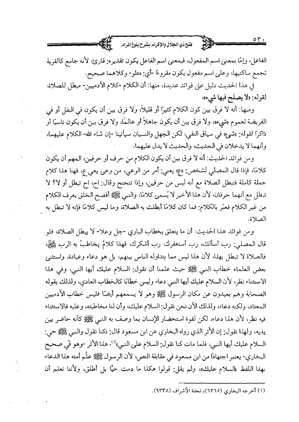 ومن فوائد هذا الحديث: أن ما يتعلق بخطاب الباري - جل وعلا- لا يبطل الصلاة، فلو قال المصلي: رب أسألك، رب أستغفرك، رب أشكرك، فهذا كلام يخاطب به الرب عز وجل، فالصلاة لا تبطل بهذا؛ لأن هذا ليس مما يتداوله الناس بينهم، بل هو دعاء وعبادة، واستثنى بعض العلماء خطاب النبي صلى الله عليه وسلم حيث علمنا أن نقول: السلام عليك أيها النبي، وفي هذا الاستثناء نظر؛ لأن السلام عليك أيها النبي دعاء وليس خطابا كالخطاب العادي، ولذلك يقوله الصحابة وهم بعيدون عن مكان الرسول صلى الله عليه وسلم وهو لا يسمعهم أيضا فليس خطاب الآدميين المعتاد، ولكنه دعاء، ولذلك الآن نحن نقول: السلام عليك، وأن لنا مخاطبته، وعليه فالاستثناء فيه نظر؛ لأن هذا دعاء، لكن لقوة استحضار الإنسان بما وصف به النبي صلى الله عليه وسلم كأنه حاضر بين يديه؛ ولهذا نقول: إن الأثر الذي رواه البخاري عن ابن مسعود قال: "كنا نقول والنبي صلى الله عليه وسلم حي: السلام عليك أيها النبي، فلما مات كنا نقول: السلام على النبي". هذا الأثر - وهو في صحيح البخاري- يعتبر اجتهادا من ابن مسعود في مقابلة النص؛ لأن الرسول صلى الله عليه وسلم علم أمته هذا الدعاء بهاذ اللفظ "السلام عليك"، ولم يقل: قولوا هكذا ما دمت حيا بل أطلق، ولأننا نعلم أن