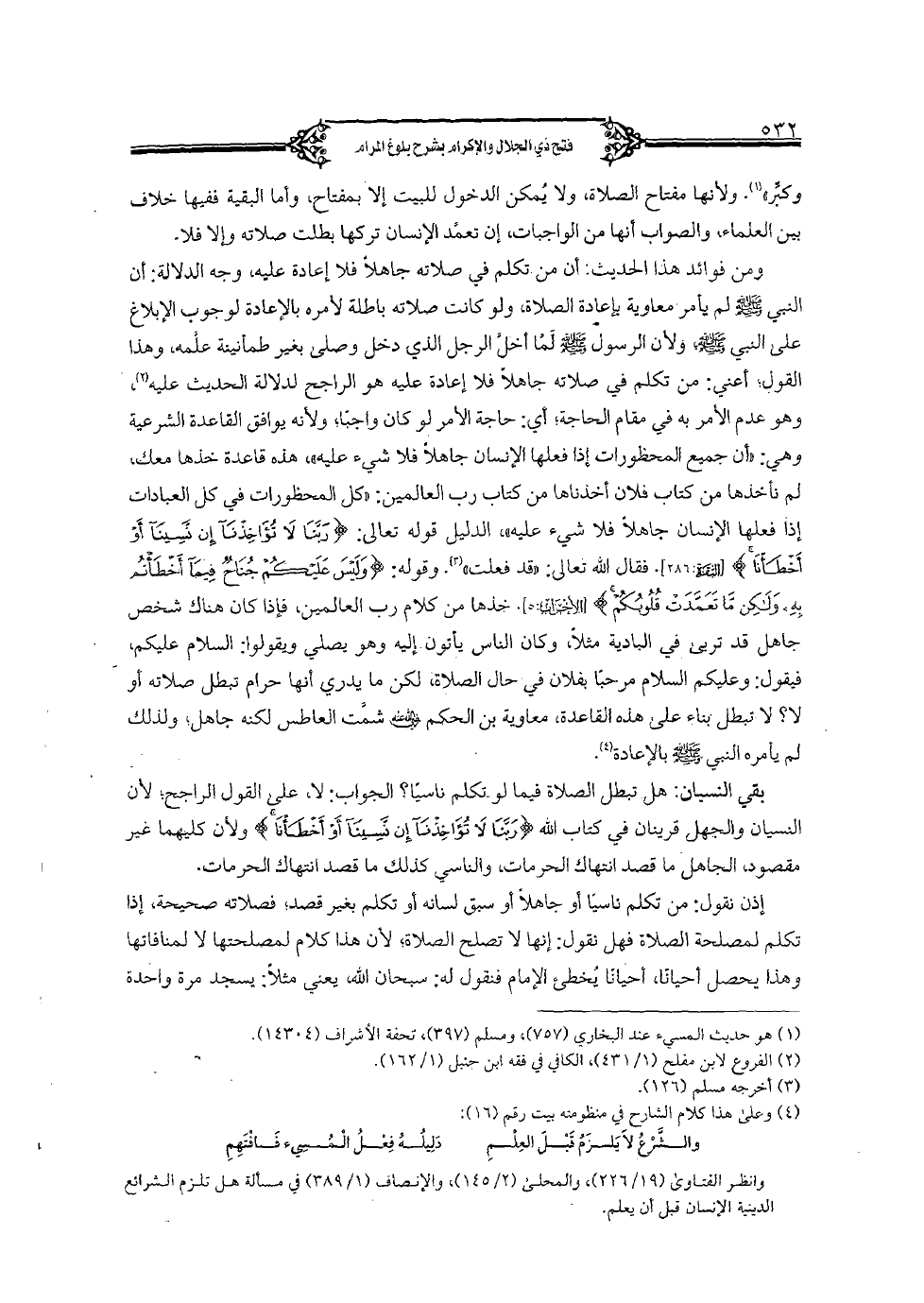 ومن فوائد هذا الحديث: أن من تكلم في صلاته جاهلا فلا إعادة عليه، وجه الدلالة: أن النبي صلى الله عليه وسلم لم يأمر معاوية بإعادة الصلاة، ولو كانت صلاته باطلة لأمره بالإعادة لوجوب الإبلاغ على النبي صلى الله عليه وسلم، ولأن الرسول صلى الله عليه وسلم لما أخل الرجل الذي دخل وصلى بغير طمأنينة علمه، وهذا القول؛ أعني: من تكلم في صلاته جاهلا فلا إعادة عليه هو الراجح لدلالة الحديث عليه، وهو عدم الأمر به في مقام الحاجة؛ أي: حاجة الأمر لو كان واجبا؛ ولأنه يوافق القاعدة الشرعية وهي: "أن جميع المحظورات إذا فعلها الإنسان جاهلا فلا شيء عليه"، هذه قاعدة خذها معك، لم نأخذها من كتاب فلان أخذناها من كتاب رب العالمين: "كل المحظورات في كل العبادات إذا فعلها الإنسان جاهلا فلا شيء عليه"، الدليل قوله تعالى: {ربنا لا تؤاخذنا إن نسينا أو أخطأنا} [البقرة: 286]. فقال الله تعالى: "قد فعلت". {وليس عليكم جناح فيما أخطأتم به ولكن ما تعمدت قلوبكم} [الأحزاب: 5]. خذها من كلام رب العالمين، فإذا كان هناك شخص جاهل قد تربى في البادية مثلا، وكان الناس يأتون إليه وهو يصلي ويقولوا: السلام عليكم، فيقول: وعليكم السلام مرحبا بفلان في حال الصلاة، لكن ما يدري أنها حرام تبطل صلاته أو لا؟ لا تبطل بناء على هذه القاعدة، معاوية بن الحكم رضي الله عنه شمت العاطس لكنه جاهل؛ ولذلك لم يأمره النبي صلى الله عليه وسلم بالإعادة.