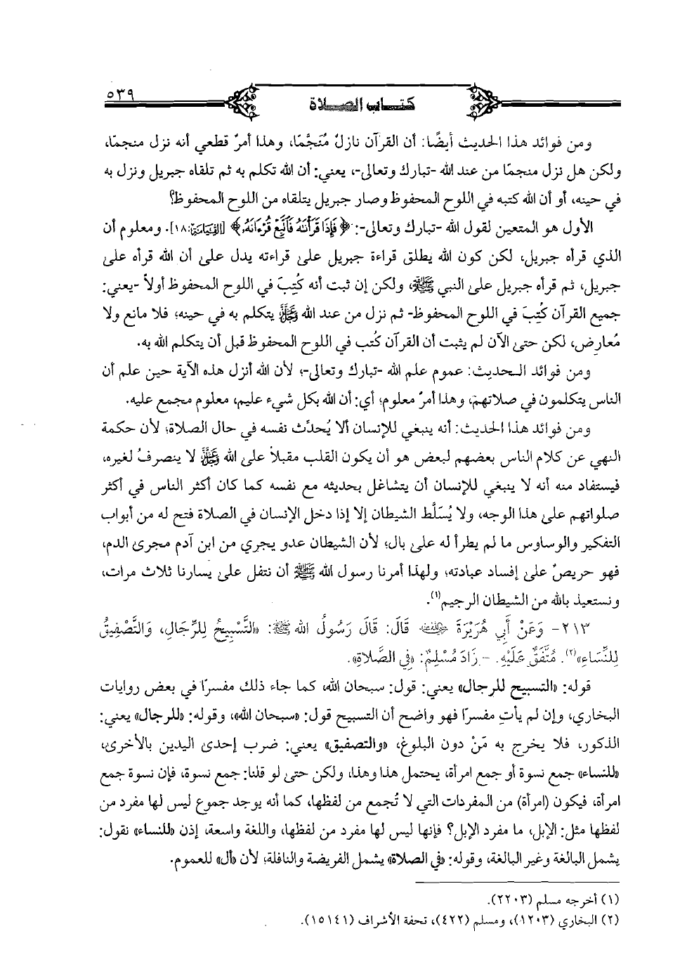 قوله: "التسبيح للرجال" يعني: قول: سبحان الله، كما جاء ذلك مفسرا في بعض روايات البخاري، وإن لم يأت مفسرا فهو واضح أن التسبيح قول: "سبحان الله"، وقوله: "للرجال" يعني: الذكور، فلا يخرج به من دون البلوغ، "والتصفيق" يعني: ضرب إحدى اليدين بالأخرى، "للنساء" جمع نسوة أو جمع امرأة، يحتمل هذا وهذا، ولكن حتى لو قلنا: جمع نسوة، فإن نسوة جمع امرأة، فيكون (امرأة) من المفردات التي لا تجمع من لفظها، كما أنه يوجد جموع ليس لها مفرد من لفظها مثل: الإبل، ما مفرد الإبل؟ فإنها ليس لها مفرد من لفظها، واللغة واسعة، إذن "للنساء" نقول: يشمل البالغة وغير البالغة، وقوله: "في الصلاة" يشمل الفريضة والنافلة؛ لأن "أل" للعموم.