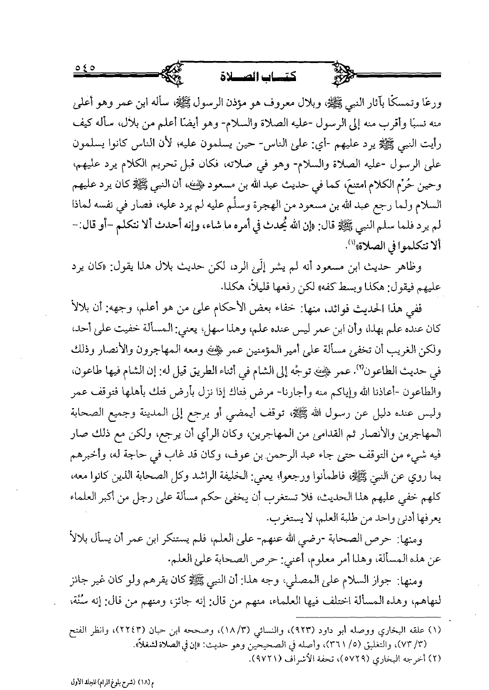 ورعا وتمسكا بآثار النبي صلى الله عليه وسلم، وبلال معروف هو مؤذن الرسول صلى الله عليه وسلم، سأله ابن عمر وهو أعلى منه نسبا وأقرب منه إلى الرسول - عليه الصلاة والسلام- وهو أيضا أعلم من بلال، سأله كيف رأيت النبي صلى الله عليه وسلم يرد عليهم - أي: على الناس- حين يسلمون عليه؛ لأن الناس كانوا يسلمون على الرسول - عليه الصلاة والسلام- وهو في صلاته، فكان قبل تحريم الكلام يرد عليهم، وحين حرم الكلام امتنع، كما في حديث عبد الله بن مسعود رضي الله عنه، أن النبي صلى الله عليه وسلم كان يرد عليهم السلام ولما رجع عبد الله بن مسعود من الهجرة وسلم عليه لم يرد عليه، فصار في نفسه لماذا لم يرد فلما سلم النبي صلى الله عليه وسلم قال: "إن الله يحدث في أمره ما شاء، وإنه أحدث ألا نتكلم- أو قال: - ألا تتكلموا في الصلاة".