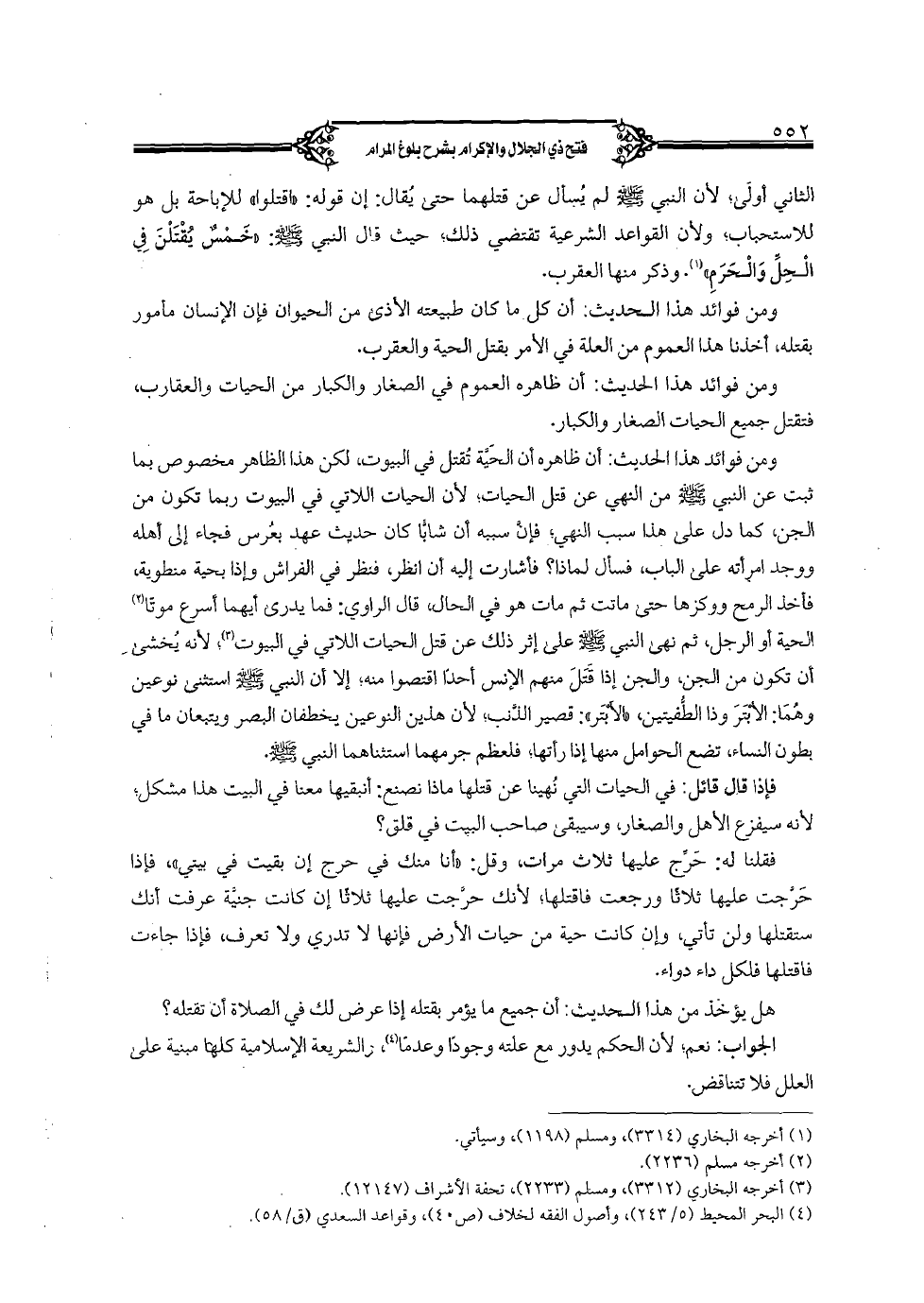 ومن فوائد هذا الحديث: أن ظاهره أن الحية تقتل في البيوت، لكن هذا الظاهر مخصوص بما ثبت عن النبي صلى الله عليه وسلم من النهي عن قتل الحيات؛ لأن الحيات اللاتي في البيوت ربما تكون من الجن، كما دل على هذا سبب النهي؛ فإن سببه أن شابا كان حديث عهد بعرس فجاء إلى أهله ووجد امرأته على الباب، فسأل لماذا؟ فأشارت إليه أن انظر، فنظر في الفراش وإذا بحية منطوية، فأخذ الرمح ووكزها حتى ماتت ثم مات هو في الحال، قال الراوي: فما يدري أيهما أسرع موتا الحية أو الرجل، ثم نهى النبي صلى الله عليه وسلم على إثر ذلك عن قتل الحيات اللاتي في البيوت؛ لأنه يخشى أن تكون من الجن، والجن إذا قتل منهم الإنس أحدا اقتصوا منه؛ إلا أن النبي صلى الله عليه وسلم استثنى نوعين وهما: الأبتر وذا الطفيتين، "الأبتر": قصير الذنب؛ لأن هذين النوعين يخطفان البصر ويتبعان ما في بطون النساء، تضع الحوامل منها إذا رأتها؛ فلعظم جرمها استثناهما النبي صلى الله عليه وسلم.