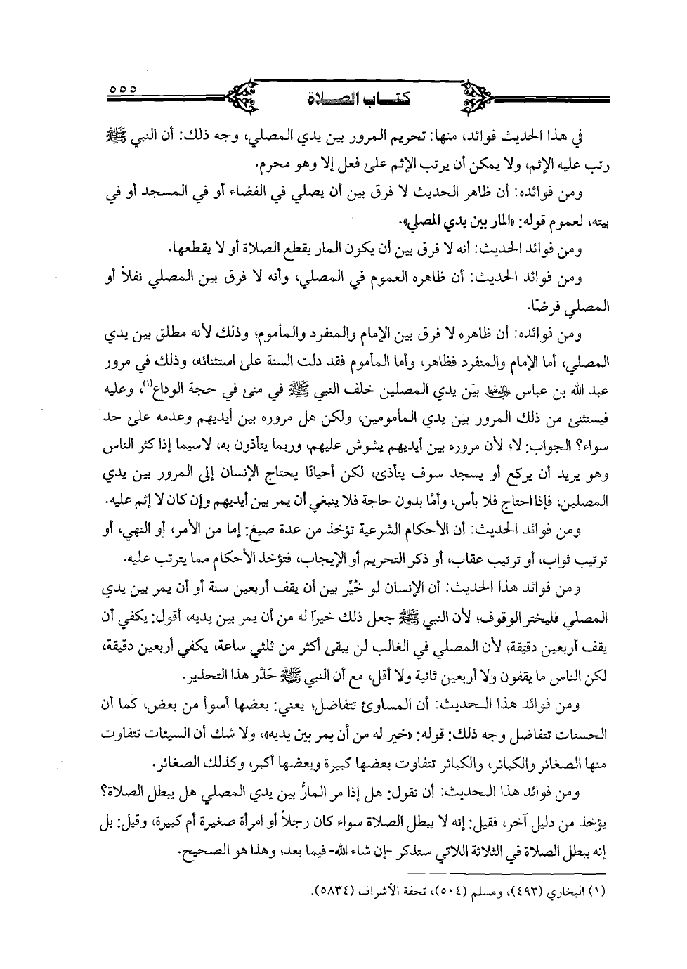 ومن فوائده: أن ظاهره لا فرق بين الإمام المنفرد والمأموم؛ وذلك لأنه مطلق بين يدي المصلي، أما الإمام والمنفرد فظاهر، وأما المأموم فقد دلت السنة على استثنائه، وذلك في مرور عبد الله بن عباس رضي الله عنهما بين يدي المصلي خلف النبي صلى الله عليه وسلم في منى في حجة الوداع، وعليه فيستثنى من ذلك المرور بين يدي المأمومين، ولكن هل مروره بين أيديهم وعدمه على حد سواء؟ الجواب: لا؛ لأن مروره بين أيديهم يشوش عليهم، وربما يتأذون به، لاسيما إذا كثر الناس وهو يريد أن يركع أو يسجد سوف يتأذى، لكن أحيانا يحتاج الإنسان على المرور بين يدي المصلين، فإذا احتاج فلا بأس، وأما بدون حاجة فلا ينبغي أن يمر بين أيديهم وإن كان لا لإثم عليه.