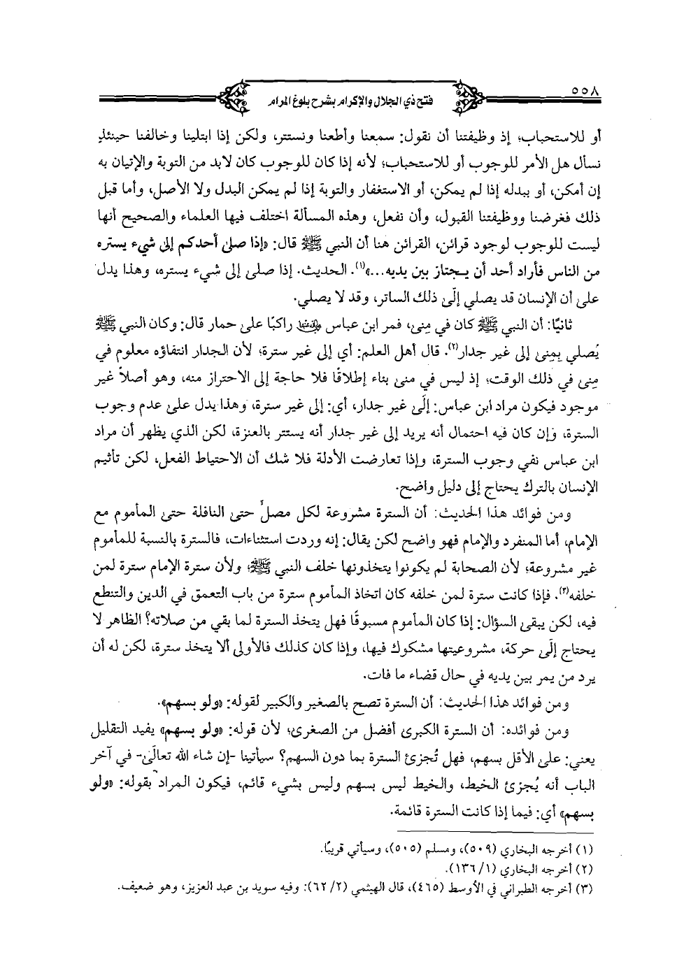 ثانيا: أن النبي صلى الله عليه وسلم كان في منى، فمر ابن عباس رضي الله عنهما راكبا على حمار قال: وكان النبي صلى الله عليه وسلم يصلي بمنى إلى غير جدار. قال أهل العلم: أي إلى غير سترة؛ لأن الجدار انتفاؤه معلوم في منى في ذلك الوقت؛ إذ ليس في منى بناء إطلاقا فلا حاجة إلى الاحتراز منه، وهو أصلا غير موجود فيكون مراد ابن عباس: إلى غير جدار، أي: إلى غير سترة، وهذا يدل على عدم وجوب السترة، وإن كان فيه احتمال أنه يريد إلى غير جدار أنه يستتر بالعنزة، لكن الذي يظهر أن مراد ابن عباس نفي وجوب السترة، وإذا تعارضت الأدلة فلا شك أن الاحتياط الفعل، لكن تأثيم الإنسان بالترك إلى دليل واضح.