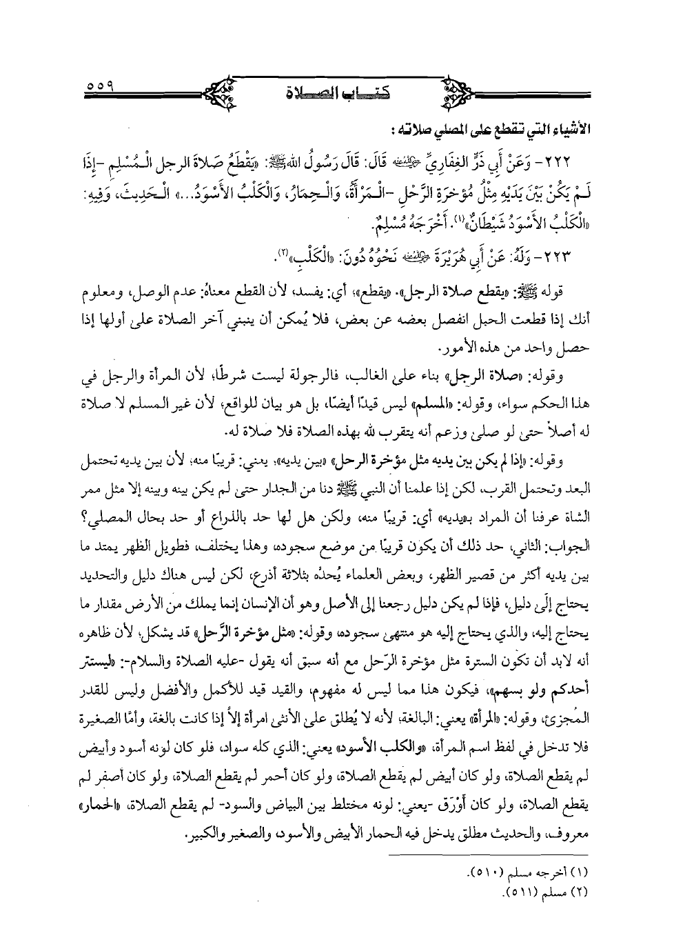 الجواب: الثاني، حد ذلك أن يكون قريبا من موضع سجوده، وهذا يختلف، فطويل الظهر يمتد ما بين يديه أكثر من قصير الظهر، وبعض العلماء يحده بثلاثة أذرع، لكن ليس هناك دليل والتحديد يحتاج إلى دليل، فإذا لم يكن دليل رجعنا إلى الأصل وهو أن الإنسان إنما يملك من الأرض مقدار ما يحتاج إليه، والذي يحتاج إليه هو منتهى سجوده، وقوله: "مثل مؤخرة الرحل" قد يشكل؛ لأن ظاهره أنه لابد أن تكون السترة مثل مؤخرة الرحل مع أنه سبق أنه يقول - عليه الصلاة والسلام-: "ليستتر أحدكم ولو بسهم"، فيكون هذا مما ليس له مفهوم، والقيد قيد للأكمل والأفضل وليس للقدر المجزئ، وقوله: "المرأة" يعني: البالغة؛ لأنه لا يطلق على الأنثى امرأة إلا إذا كانت بالغة، وأما الصغيرة فلا تدخل في لفظ اسم المرأة، "والكلب الأسود" يعني: الذي كله سواد، فلو كان لونه أسود وأبيض لم يقطع الصلاة؛ ولو كان أبيض لم يقطع الصلاة، ولو كان أحمر لم يقطع الصلاة، ولو كان أصفر لم يقطع الصلاة، ولو كان أورق- يعني: لونه مختلط بين البياض والسواد - لم يقطع الصلاة، "الحمار" معروف، والحديث مطلق يدخل فيه الحمار الأبيض والأسود، والصغير والكبير.