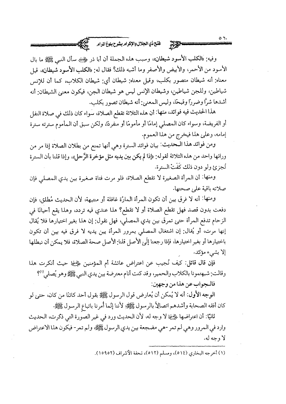 فإن قال قائل: كيف نجيب عن اعتراض عائشة أم المؤمنين رضي الله عنها حيث أنكرت هذا وقالت: شبهتمونا بالكلاب والحمير، وقد كنت أنام معترضة بين يدي النبي صلى الله عليه وسلم وهو يصلي؟