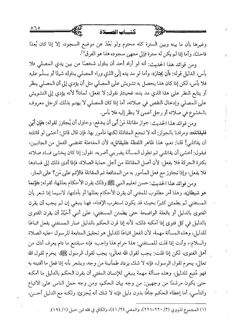 ومن فوائد هذا الحديث: جواز مقاتلة من أبى أن يندفع، وحاول أن يجاوز لقوله: "فإن أبى فليقاتله"، ومرادنا بالجواز: أنه لا تمتنع المقاتلة لكنها مأمور بها. فإن قال قائل: أخشى لو قاتلته أن يقاتلني؟ قلنا: نعم، هذا ظاهر اللفظة "فليقاتل"؛ لأن المفاعلة تقتضي الفعل من الجانبين، فيقول: أخشى أن يقاتلني ثم تطول المسألة يضربني أضربه، نقول: إذا كان يخشى فساد صلاته بكثرة الحركة فلا يفعل؛ لأن أصل المقاتلة من اجل حماية الصلاة، فإذا أدى ذلك إلى فسادها فلا يفعل، وإذا تجاوز من فعل المأمور به من المدافعة ثم المقاتلة فالإثم على من؟ على المار.