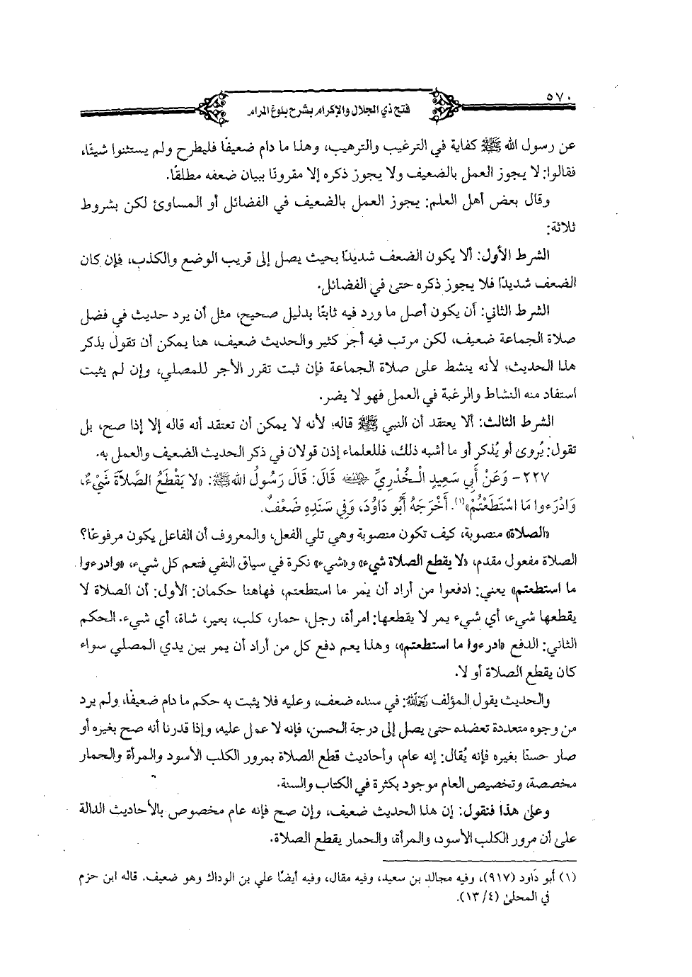 227 - وعن أبي سعيد الخدري رضي الله عنه قال: قال رسول الله صلى الله عليه وسلم: "لا يقطع الصلاة شيء، وادرءوا ما استطعتم". أخرجه أبو داود، وفي سنده ضعف.