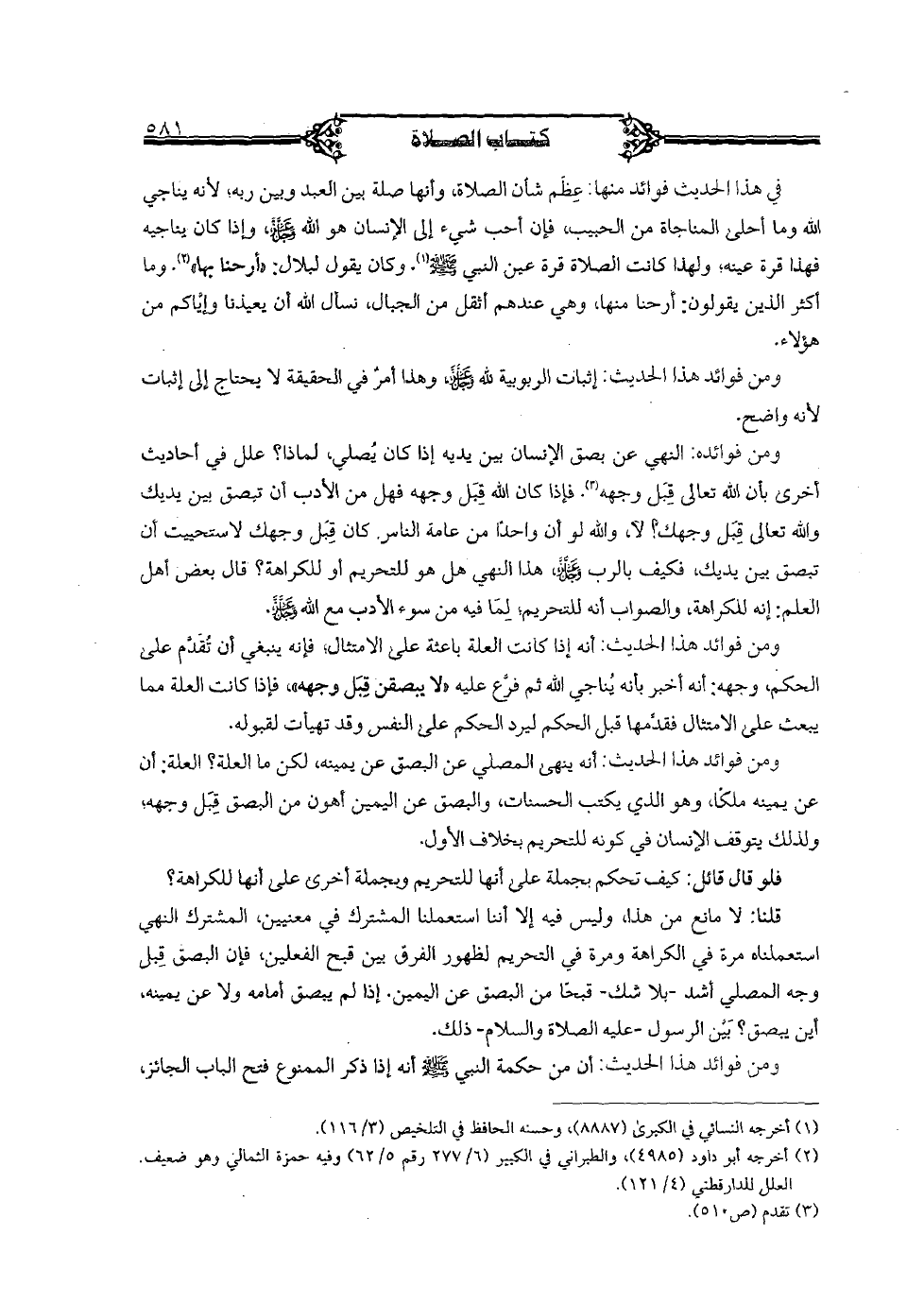 ومن فوائد هذا الحديث: أنه إذا كانت العلة باعثة على الامتثال؛ فإنه ينبغي أن تقدم على الحكم، وجهه: أنه اخبر بأنه يناجي الله ثم فرع عليه "لا يبصقن قبل وجهه"، فإذا كانت العلة مما يبعث على الامتثال فقدمها قبل الحكم ليرد الحكم على النفس وقد تهيأت لقبوله.