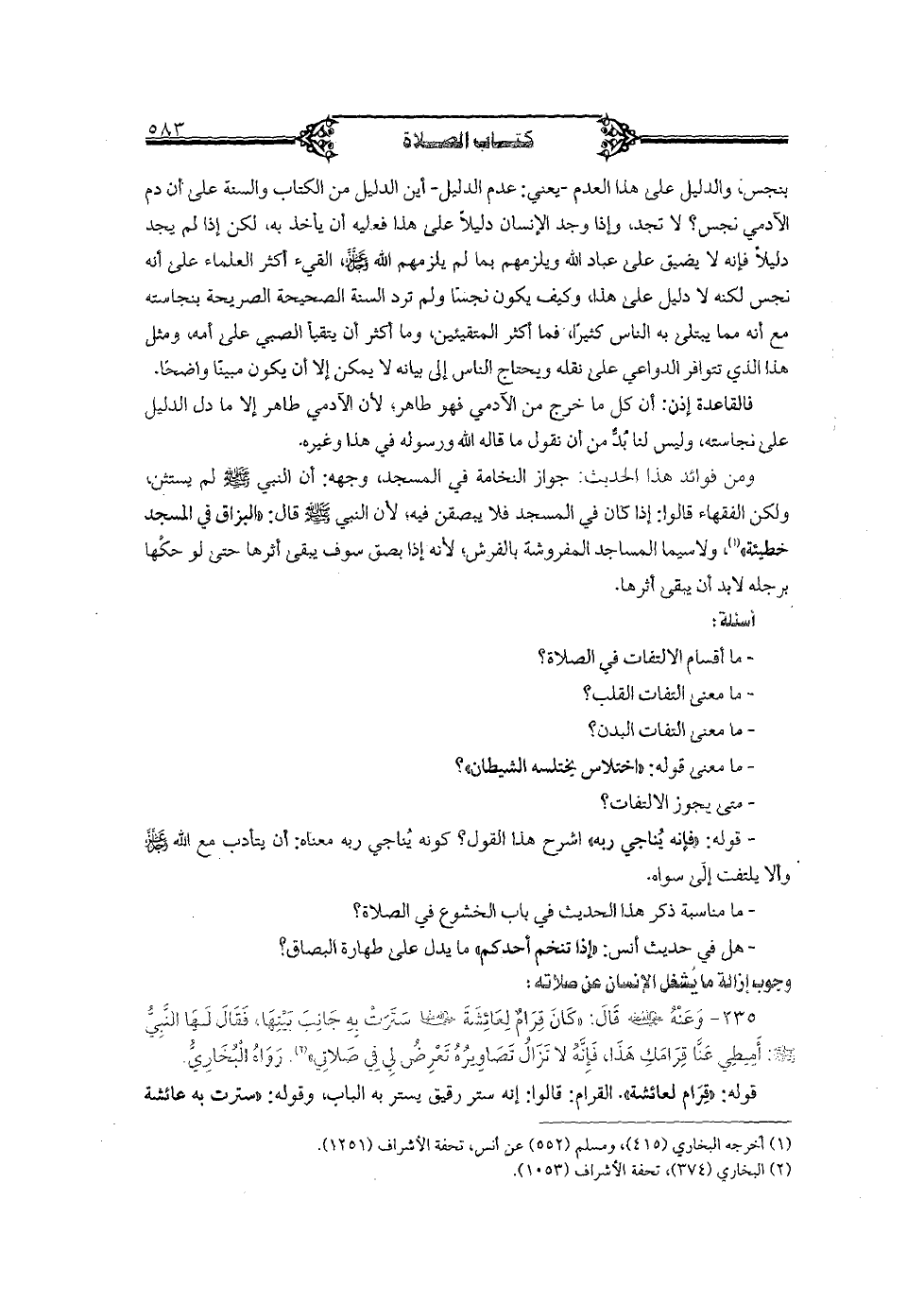 - هل في حديث أنس: "إذا تنخم أحدكم" ما يدل على طهارة البصاق؟