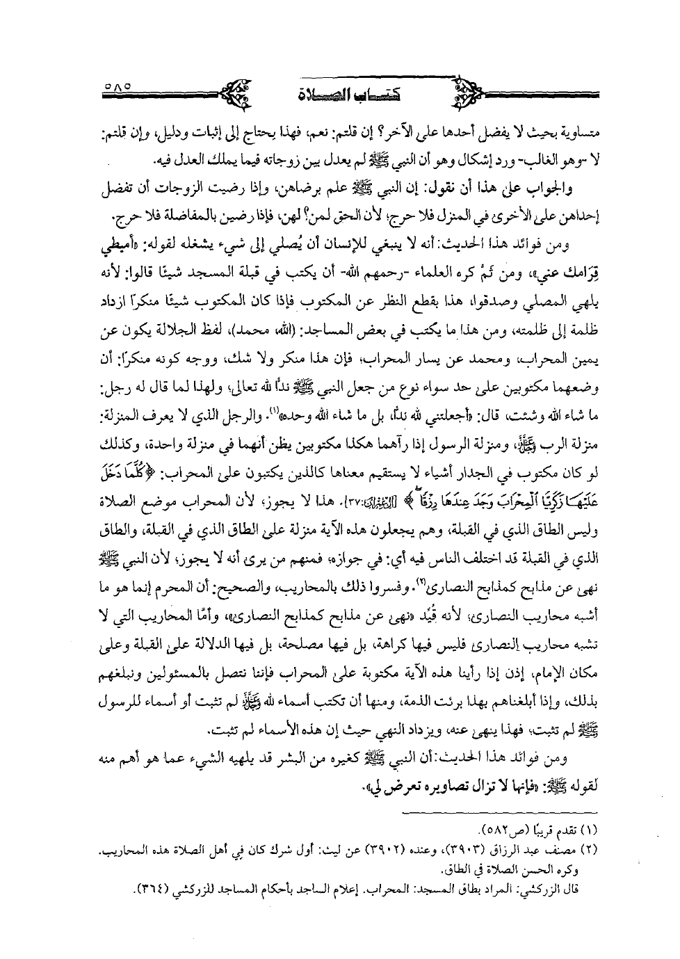 ومن فوائد هذا الحديث: أنه لا ينبغي للإنسان أن يصلي إلى شيء يشغله لقوله: "أميطي قرامك عني"، ومن ثم كره العلماء - رحمهم الله- أن يكتب في قبله المسجد شيئا قالوا: لأنه يلهي المصلي وصدقوا، هذا بقطع النظر عن المكتوب فإذا كان المكتوب شيئا منكرا ازداد ظلمة إلى ظلمته، ومن هذا ما يكتب في بعض المساجد: (الله، محمد)، لفظ الجلالة يكون عن يمين المحراب، ومحمد عن يسار المحراب؛ فإن هذا منكر ولا شك، ووجه كونه منكرا: أن وضعهما مكتوبين على حد سواء نوع من جعل النبي صلى الله عليه وسلم ندا الله تعالى؛ ولهذا لما قال له رجل ما شاء الله وشئت، قال: "أجعلتني لله ندا، بل ما شاء الله وحده". والرجل الذي لا يعرف المنزلة: منزلة الرب عز وجل، ومنزلة الرسول إذا رآها هكذا مكتوبين يظن أنهما في منزلة واحدة، وكذلك لو كان مكتوب في الجدار أشياء لا يستقيم معناها كالذين يكتبون على المحراب: {كلما دخل عليها زكريا المحراب وجد عندها رزقا} [آل عمران: 37]. هذا لا يجوز؛ لأن المحراب موضع الصلاة وليس الطاق الذي في القبلة، وهم يجعلون هذه الآية منزلة على الطاق الذي في القبلة، والطاق الذي في القبلة قد اختلف الناس فيه أي: في جوازه؛ فمنهم من يرى أنه لا يجوز؛ لأن النبي صلى الله عليه وسلم نهى عن مذابح كمذابح النصارى. وفسروا ذلك بالمحاريب، والصحيح: أن المحرم إنما هو ما أشبه محاريب النصارى؛ لأنه قيد "نهى عن مذابح كمذابح النصارى"، وأما المحاريب التي لا تشبه محاريب النصارى فليس فيها كراهة، بل فيها مصلحة، بل فيها الدلالة على القبلة وعلى مكان الإمام، إذن إذا رأينا هذه الآية مكتوبة على المحراب فإننا نتصل بالمسئولين ونبلغهم بذلك، وإذا أبلغناهم بهذا برئت الذمة، ومنها أن تكتب أسماء لله عز وجل لم تثبت أو أسماء للرسول صلى الله عليه وسلم لم تثبت؛ فهذا ينهى عنه ويزداد النهي حيث إن هذه الأسماء لم تثبت.