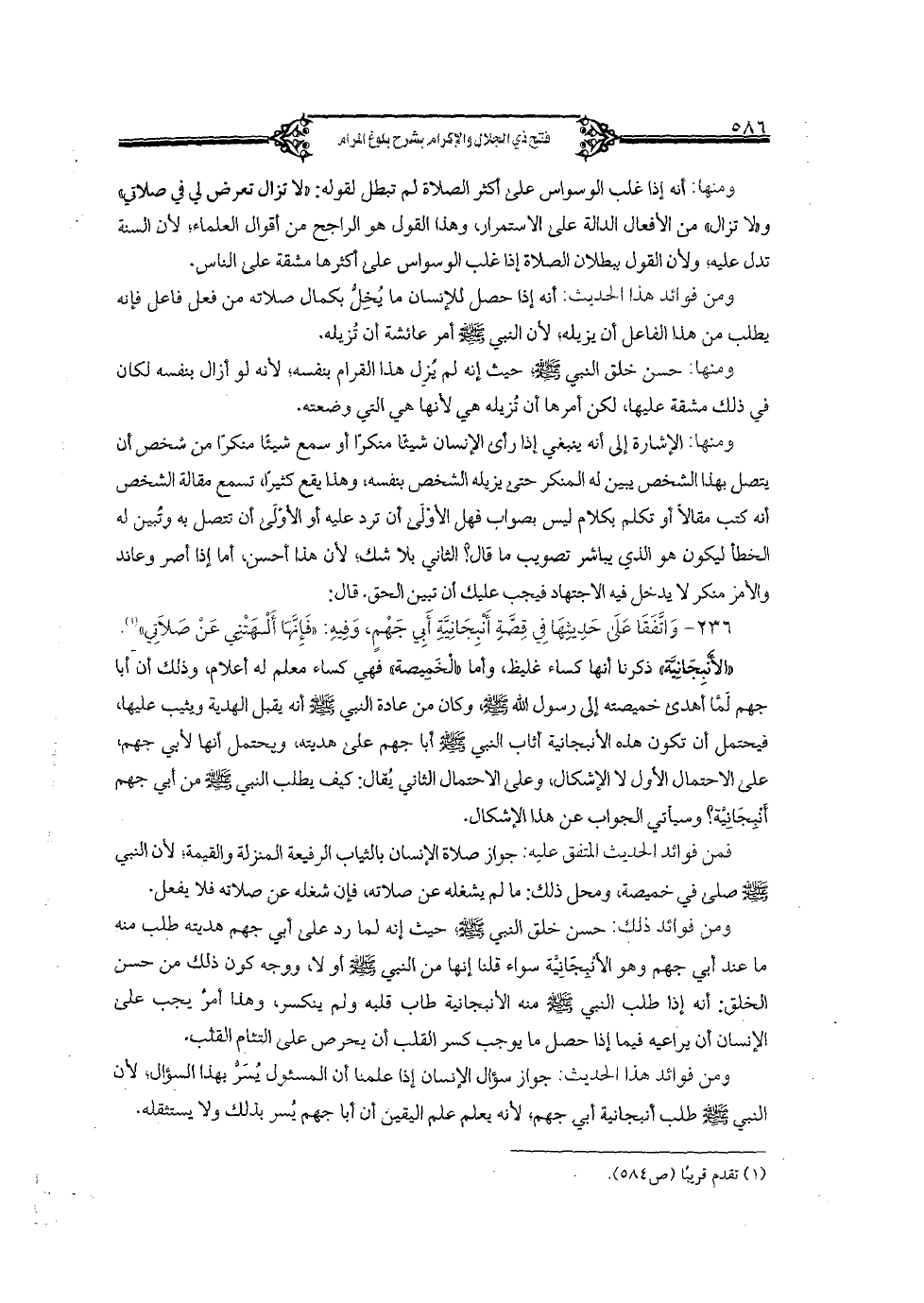 "الأنبجانية" ذكرنا أنها كساء غليظ، وأما "الخميصة" فهي كساء معلم له أعلام، وذلك أن أبا جهم لما أهدى خميصته إلى رسول الله صلى الله عليه وسلم، وكان من عادة النبي صلى الله عليه وسلم أنه يقبل الهدية ويثيب عليها، فيحتمل أن تكون هذه الأنبجانية أثاب النبي صلى الله عليه وسلم أبا جهم على هديته، ويحتمل أنها لأبي جهم، على الاحتمال الأول لا الإشكال، وعلى الاحتمال الثاني يقال: كيف يطلب النبي صلى الله عليه وسلم من أبي جهم أنبجانية؟ وسيأتي الجواب عن هذا الإشكال.