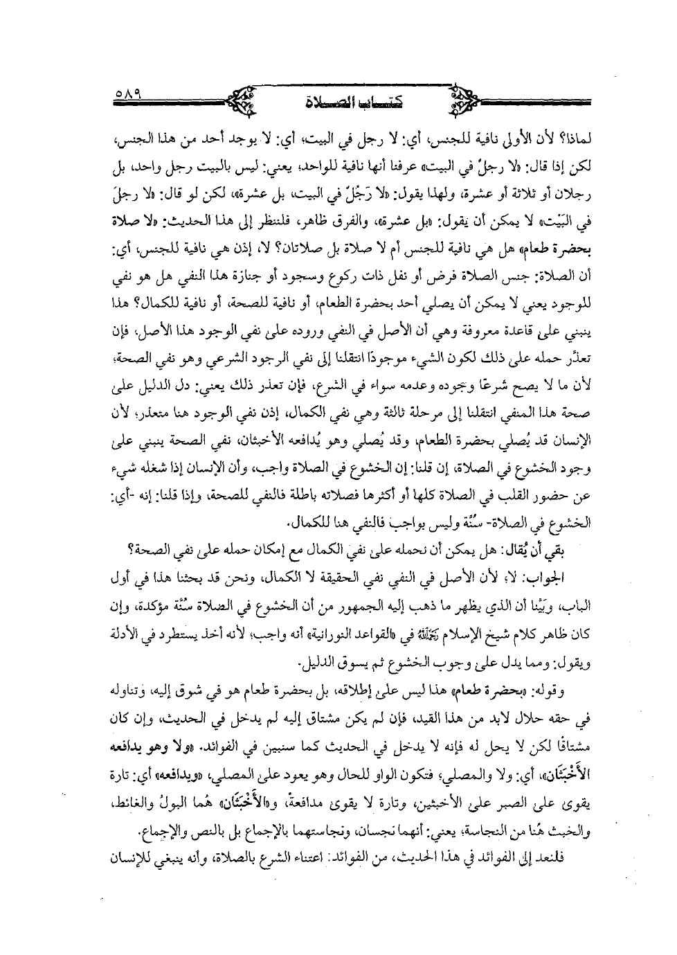 لماذا؟ لأن الأولى نافية للجنس، أي: لا رجل في البيت، أي: لا يوجد أحد من هذا الجنس، لكن إذا قال: "لا رجل في البيت" عرفنا أنها نافية للواحد؛ يعني: ليس بالبيت رجل واحد، بل رجلان أو ثلاثة أو عشرة، ولهذا يقول: "لا رجل في البيت، بل عشرة"، لكن لو قال: "لا رجل في البيت" لا يمكن أن يقول: "بل عشرة"، والفرق ظاهر، فلننظر إلى هذا الحديث: "لا صلاة بحضرة طعام" هل هي نافية للجنس أم لا صلاة بل صلاتان؟ لا، إذن هي نافية للجنس، أي: أن الصلاة: جنس الصلاة فرض أو نفل ذات ركوع وسجود أو جنازة هذا النفي هل هو نفي للوجود يعني لا يمكن أن يصلي أحد بحضرة الطعام، أو نافية للصحة، أو نافية للكمال؟ هذا ينبني على قاعدة معروفة وهي أن الأصل في النفي وروده على نفي الوجود هذا الأصل، فإن تعذر حمله على ذلك لكون الشيء موجودا انتقلنا إلى نفي الوجود الشرعي وهو نفي الصحة؛ لأن ما لا يصلح شرعا وجوده وعدمه سواء في الشرع، فإن تعذر ذلك يعني: دل الدليل على صحة هذا المنفي انتقلنا إلى مرحلة ثالثة وهي نفي الكمال، إذن نفي الوجود هنا متعذر؛ لأن الإنسان قد يصلي بحضرة الطعام، وقد يصلي وهو يدافعه الأخبثان، نفي الصحة ينبني على وجود الخشوع في الصلاة، إن قلنا: إن الخشوع في الصلاة واجب، وأن الإنسان إذا شغله شيء عن حضور القلب في الصلاة كلها أو أكثرها فصلاته باطلة فالنفي للصحة، وإذا قلنا: إنه - أي: الخشوع في الصلاة - سنة وليس بواجب فالنفي هنا للكمال.