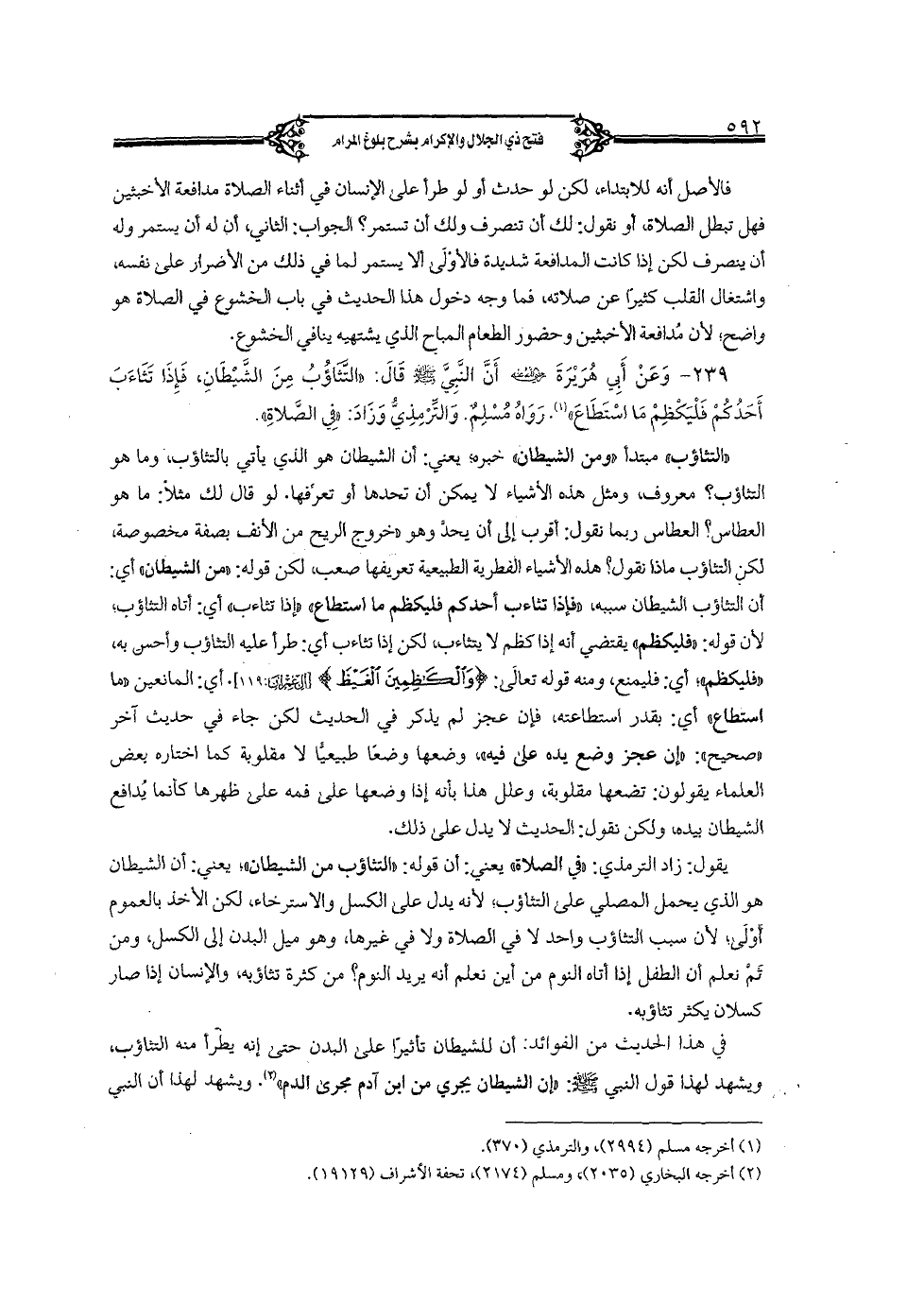 239 - وعن أبي هريرة رضي الله عنه أن النبي صلى الله عليه وسلم قال: «التثاؤب من الشيطان, فإذا تثاءب أحدكم فليكظم ما استطاع». رواه مسلم. والترمذي وزاد: «في الصلاة».