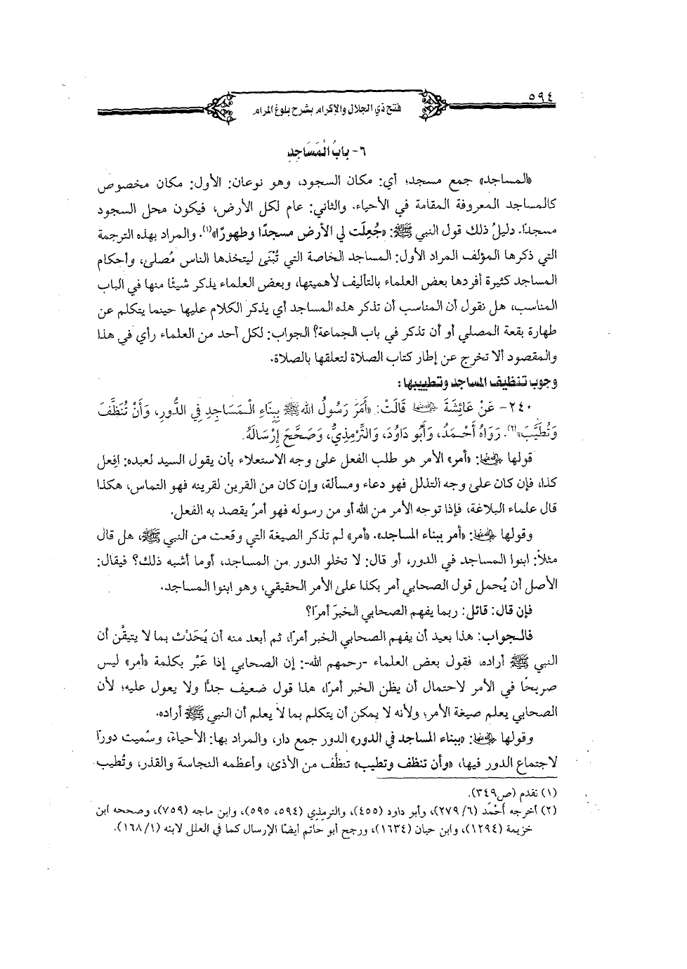 240 - عن عائشة رضي الله عنه قالت: «أمر رسول الله صلى الله عليه وسلم ببناء المساجد في الدور, وأن تنظف وتطيب». رواه أحمد, وأبو داود, والترمذي, وصحح إرساله.