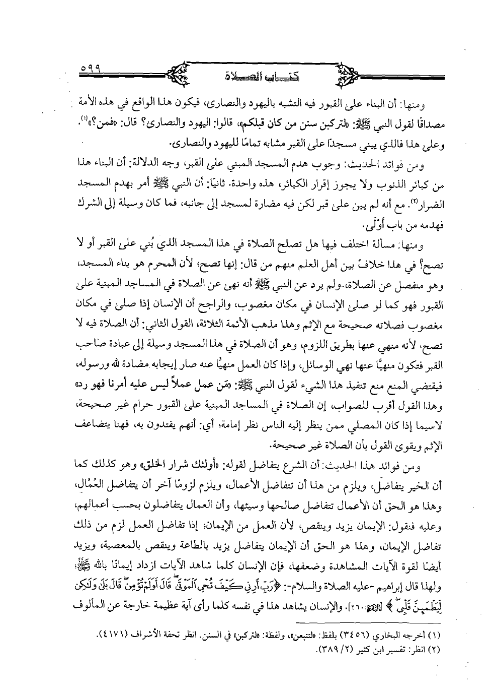 ومنها: مسألة اختلف فيها هل تصلح الصلاة في هذا المسجد الذي بني على القبر أو لا تصح؟ في هذا خلاف بين أهل العلم منهم من قال: إنها تصح؛ لأن المحرم هو بناء المسجد, وهو منفصل عن الصلاة, ولم يرد عن النبي صلى الله عليه وسلم أنه نهى عن الصلاة في المساجد المبنية على القبور فهو كما لو صلى الإنسان في مكان مغصوب, والراجح أن الإنسان إذا صلى في مكان مغصوب فصلاته صحيحة مع الإثم وهذا مذهب الأئمة الثلاثة, القول الثاني: أن الصلاة فيه لا تصح؛ لأنه منهي عنها بطريق اللزوم, وهو أن الصلاة في هذا المسجد وسيلة إلى عبادة صاحب القبر فتكون منهيًا عنها نهي الوسائل, وإذا كان العمل منهيًا عنه صار إيجابه مضادة لله ورسوله, فيقتضي المنع منع تنفيذ هذا الشيء لقول النبي صلى الله عليه وسلم: «من عمل عملًا ليس عليه أمرنا فهو رد» وهذا القول أقرب للصواب, إن الصلاة في المساجد المبنية على القبور حرام غير صحيحة, لاسيما إذا كان المصلي ممن ينظر إليه النار نظر إمامة؛ أي: أنهم يقتدون به, فهنا يتضاعف الإثم ويقوى القول بأن الصلاة غير صحيحة.