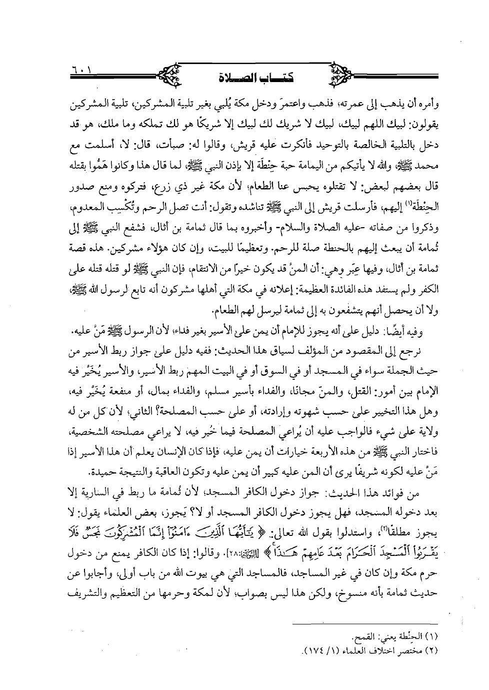وأمره أن يذهب إلى عمرته؛ فذهب واعتمر ودخل مكة يلبي بغير تلبية المشركين, تلبية المشركين يقولون: لبيك اللهم لبيك, لبيك لا شريك لك لبيك إلا شريكًا هو لك تملكه وما ملك, هو قد دخل بالتلبية الخالصة بالتوحيد فأنكرت عليه قريش, وقالوا له: صبأت, قال: لا, أسلمت مع محمد صلى الله عليه وسلم, والله لا يأتيكم من اليمامة حبة حنطة إلا بأذن النبي صلى الله عليه وسلم, لما قال هذا وكانوا هموا بقتله قال بعضهم لبعض: لا تقتلوه يحبس عنا الطعام؛ لأن مكة غير ذي زرع, فتركوه ومنع صدور الحنطة إليهم, فأرسلت قريش إلى النبي صلى الله عليه وسلم تناشده وتقول: أنت تصل الرحم وتكسب المعدوم, وذكروا من صفاته - عليه الصلاة والسلام - وأخبروه بما قال ثمامة بن أثال, فشفع النبي صلى الله عليه وسلم إلى ثمامة أن يبعث إليهم بالحنطة صلة للرحم. وتعظيمًا للبيت, وإن كان هؤلاء مشركين. هذه قصة ثمامة بن أثال, وفيها عبر وهي: أن المن قد يكون خيرًا من الانتقام, فإن النبي صلى الله عليه وسلم لو قتله قتله على الكفر ولم يستفد هذه الفائدة العظيمة: إعلانه في مكة التي أهلها مشركون أنه تابع لرسول الله صلى الله عليه وسلم, ولا أن يحصل أنهم يتشفعون به إلا ثمامة ليرسل لهم الطعام.