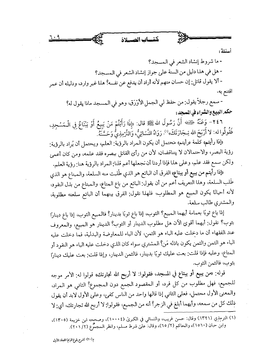 246 - وعنه رضي الله عنه أن رسول الله صلى الله عليه وسلم قال: «إذا رأيتم من يبيع أو يبتاع في المسجد, فقولوا له: لا أربح الله تجارتك». رواه النسائي, والترمذي وحسنه.