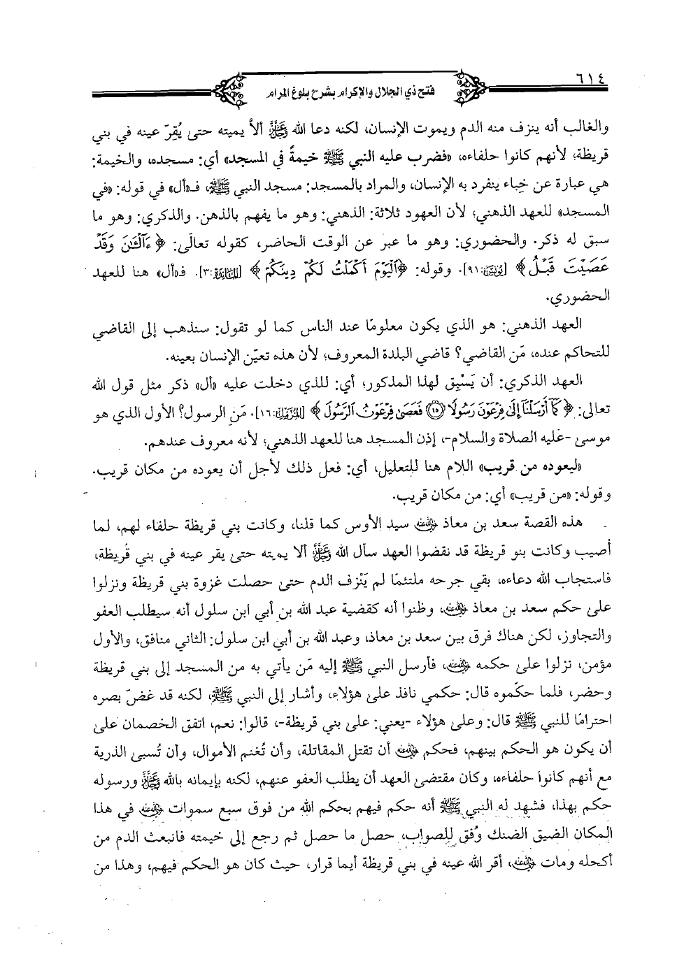والغالب أنه ينزف منه الدم ويموت الإنسان, لكنه دعا الله عز وجل ألا يميته حتى يقر عينه في بني قريظة؛ لأنهم كانوا حلفاءه, «فضرب عليه النبي صلى الله عليه وسلم خيمةً في المسجد» أي: مسجده, والخيمة: هي عبارة عن خبار ينفرد به الإنسان, والمراد بالمسجد: مسجد النبي صلى الله عليه وسلم, فـ «أل» في قوله: «في المسجد» للعهد الذهني؛ لأن العهود ثلاثة: الذهني: وهو ما يفهم بالذهن. والذكري: وهو ما سبق له ذكر. والحضوري: وهو ما عبر عن الوقت الحاضر, كقوله تعالى: {الآن وقد عصيت قبل} [يونس: 91]. وقوله: {اليوم أكملت لكم دينكم} [المائدة: 3]. فـ «أل» هنا للعهد الحضوري.