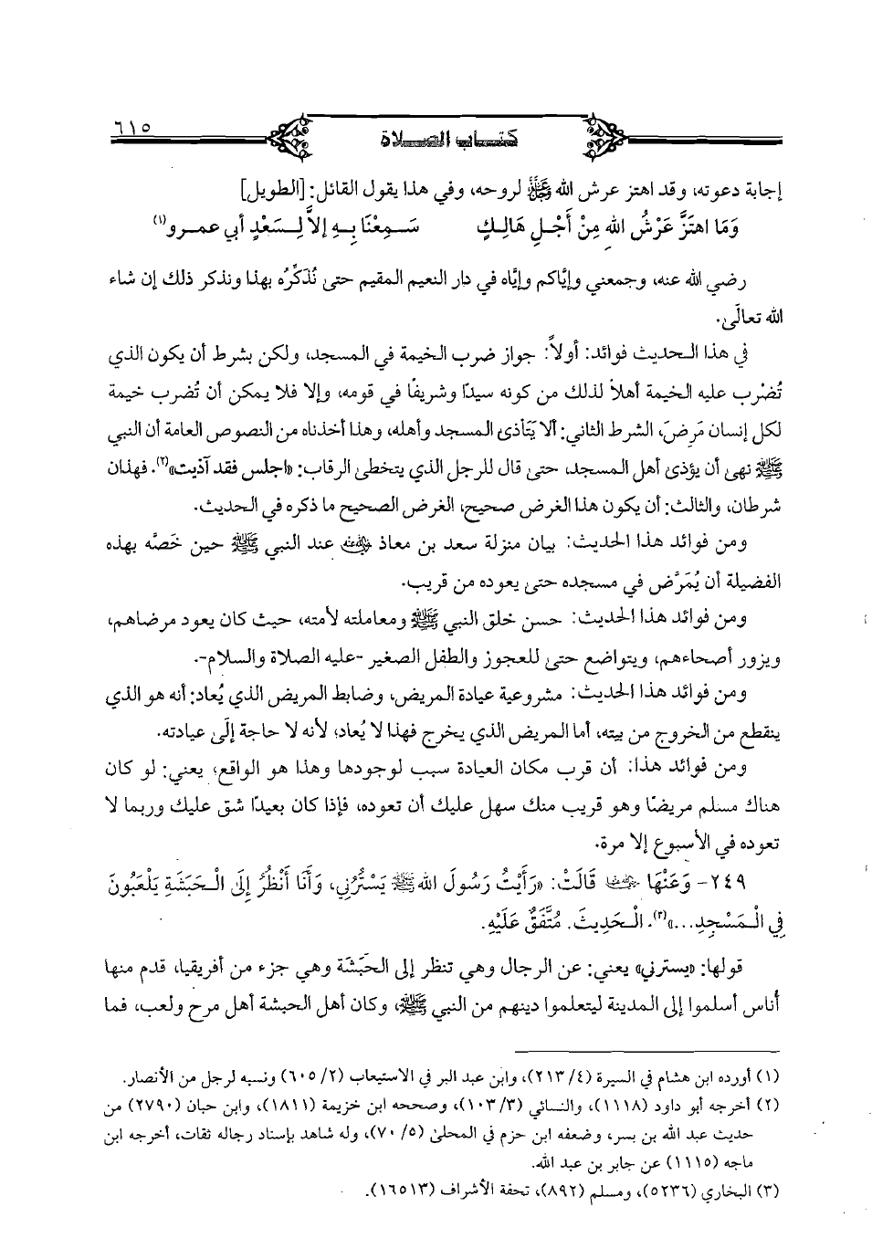 في هذا الحديث فوائد: أولًا: جواز ضرب الخيمة في المسجد, ولكن بشرط أن يكون الذي تضرب عليه الخيمة أهلًا لذلك من كونه سيدًا وشريفًا في قومه, وإلا فلا يمكن أن تضرب خيمة لكل إنسان مرض, الشرط الثاني: ألا يتأذى المسجد وأهله, وهذا أخذناه من النصوص العامة أن النبي صلى الله عليه وسلم نهى أن يؤذى أهل المسجد, حتى قال للرجل الذي يتخطى الرقاب: «اجلس فقد آذيت». فهذان شرطان, والثالث: أن يكون هذا الغرض صحيح, الغرض الصحيح ما ذكره في الحديث.