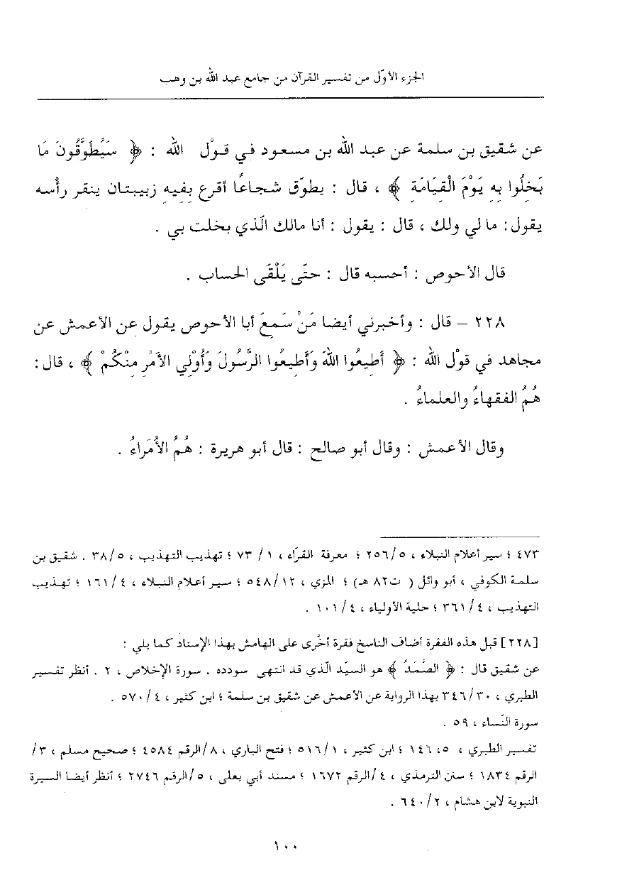 228 - قال: وأخبرني أيضا من سمع أبا الأحوص يقول عن الأعمش، عن مجاهد في قول الله: {أطيعوا الله وأطيعوا الرسول وأولي الأمر منكم}، قال: هم الفقهاء والعلماء.