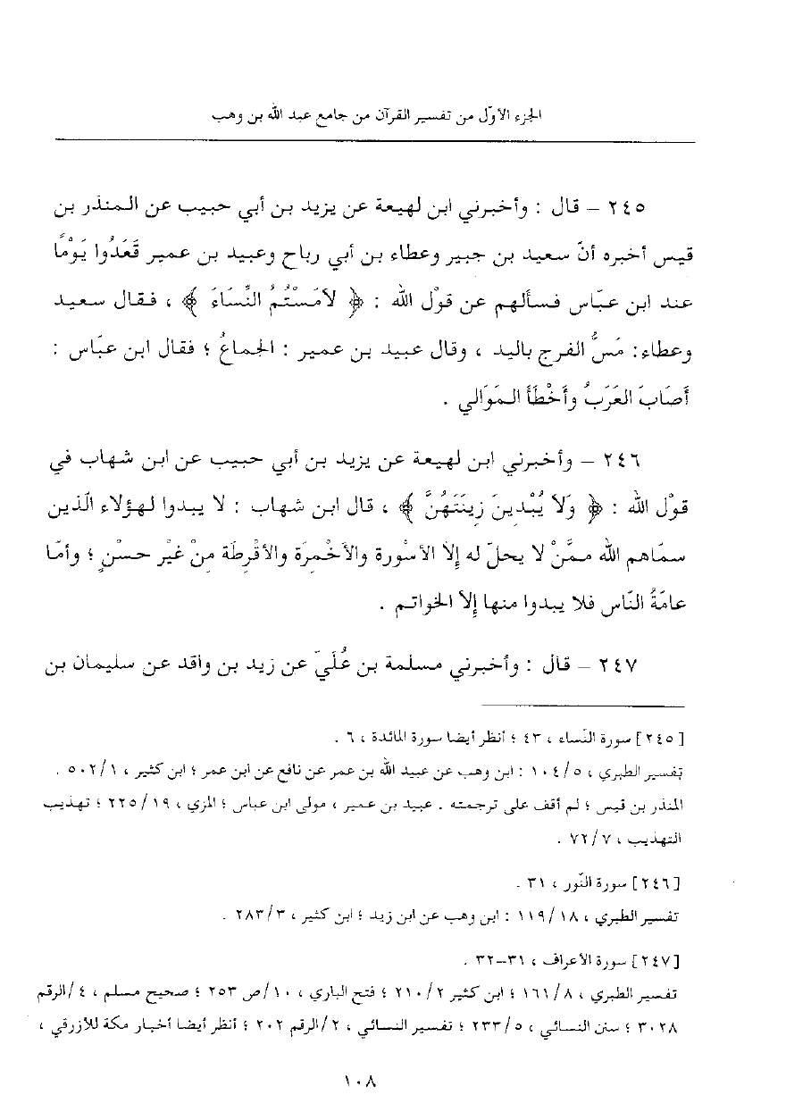245 - قَالَ: وَأَخْبَرَنِي ابْنُ لَهِيعَةَ عَنْ يَزِيدَ بْنِ أَبِي حَبِيبٍ عَنِ الْمُنْذِرِ بْنِ قَيْسٍ أَخْبَرَهُ أَنَّ سَعِيدَ بْنَ جُبَيْرٍ وَعَطَاءَ بْنَ أَبِي رَبَاحٍ وَعُبَيْدَ بْنَ عُمَيْرٍ قَعَدُوا يَوْمًا عِنْدَ ابْنِ عَبَّاسٍ فَسَأَلَهُمْ عَنْ قَوْلِ اللَّهِ: {لامَسْتُمُ النساء}، فَقَالَ سَعِيدٌ وَعَطَاءٌ: مَسُّ الْفَرْجِ بِالْيَدِ، وقال عبيد ابن عُمَيْرٍ: الْجِمَاعُ؛ فَقَالَ ابْنُ عَبَّاسٍ: أَصَابَ الْعَرَبُ وأخطأ الموالي.